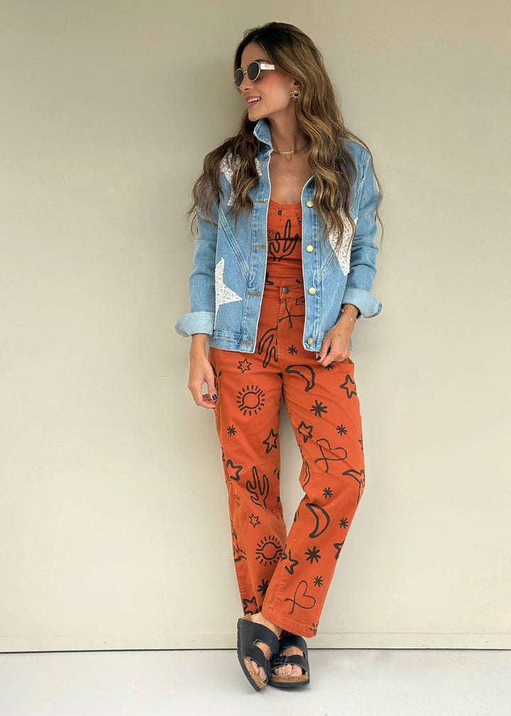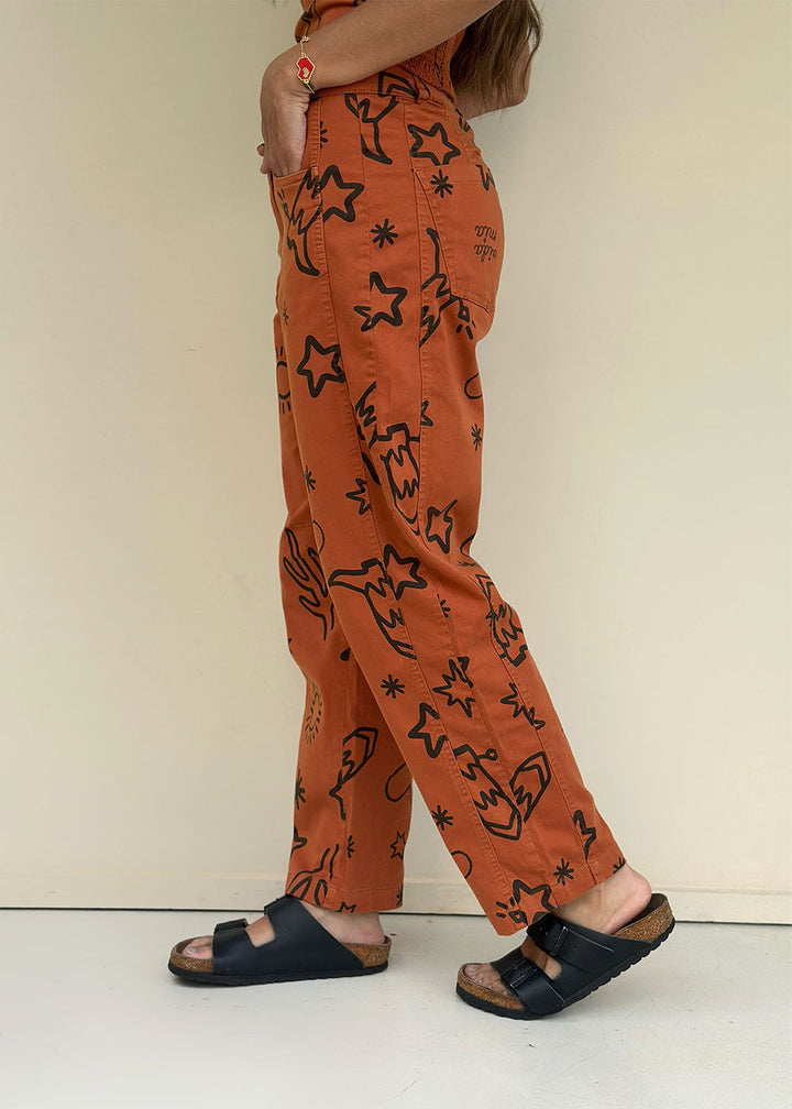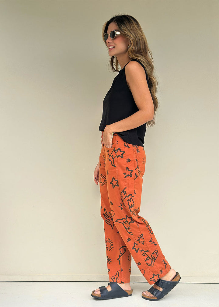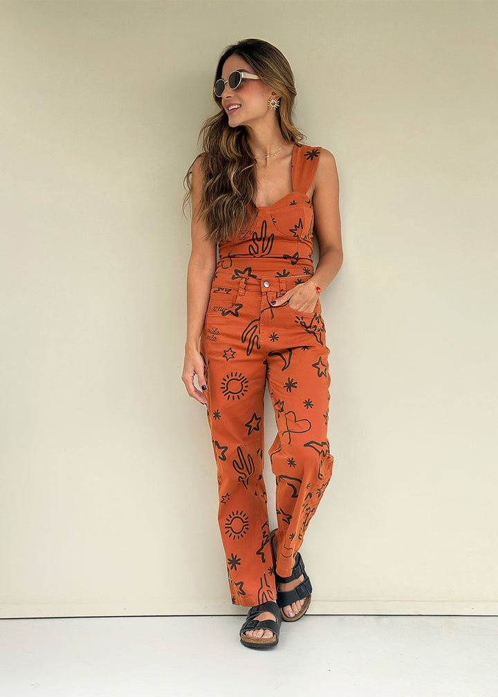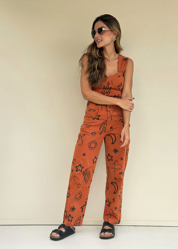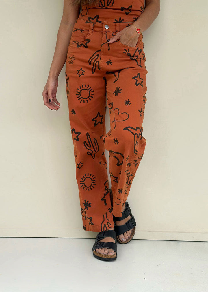 El Pantalón Adara está elaborado en popelina color terracota con un estampado de inspiración botánica y western que combina personalidad y frescura. Incluye pretina con pasadores, bolsillos funcionales delanteros y posteriores, cortes laterales y pinzas en la rodilla que aportan estructura a la silueta amplia.