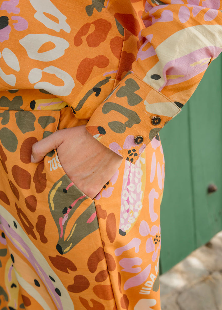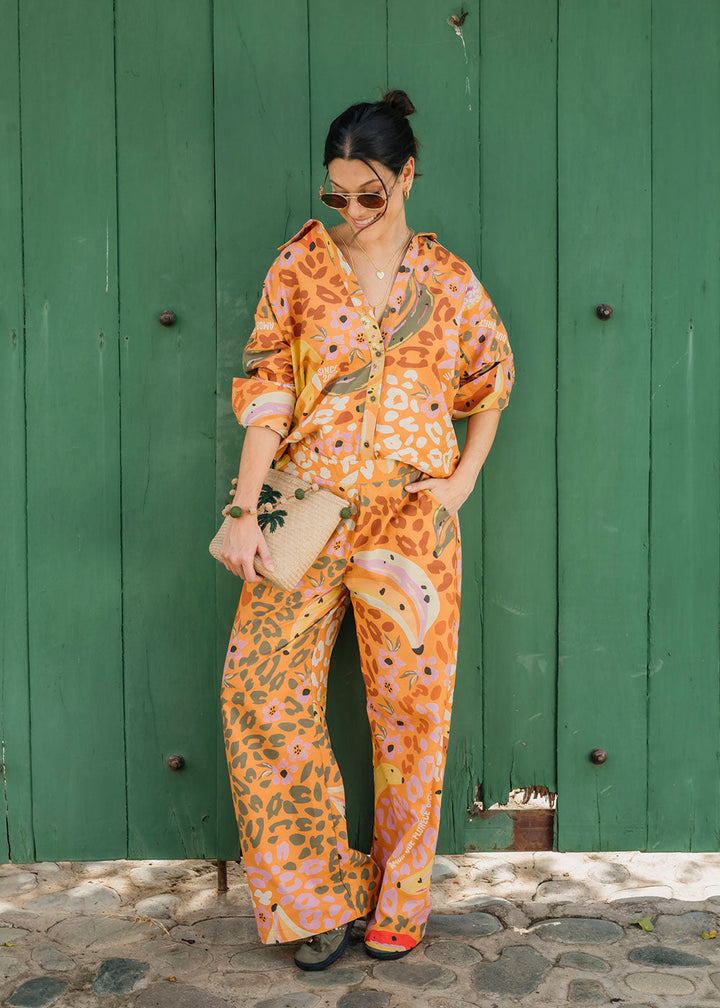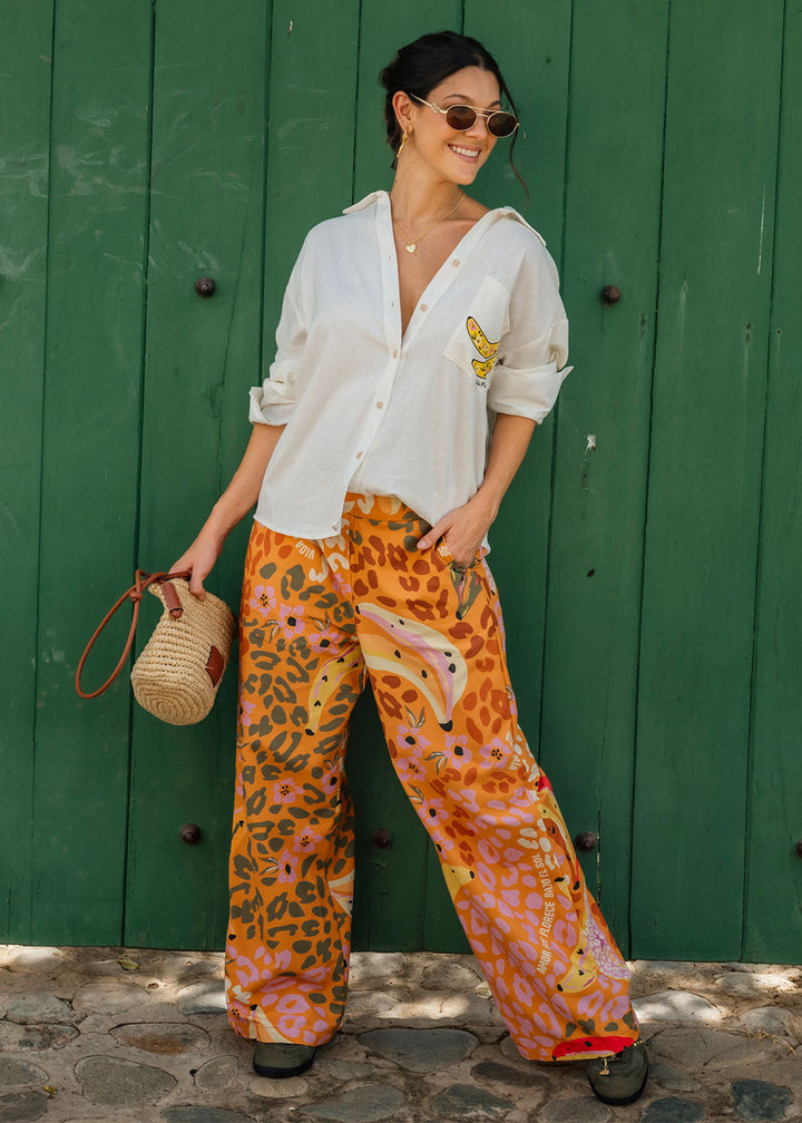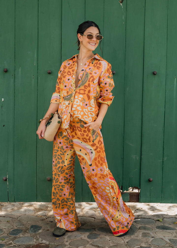 El Pantalón Atenea es un pantalón amplio en efecto lino con estampado fondeado animal print. Lleva pretina con elástico posterior y bolsillos funcionales en laterales para mayor comodidad.