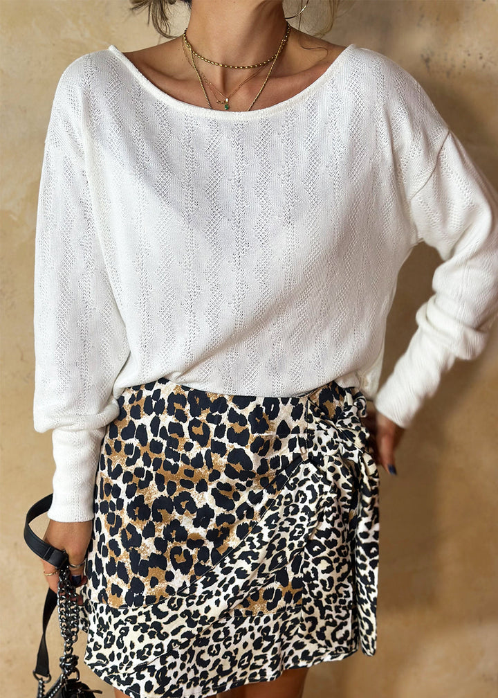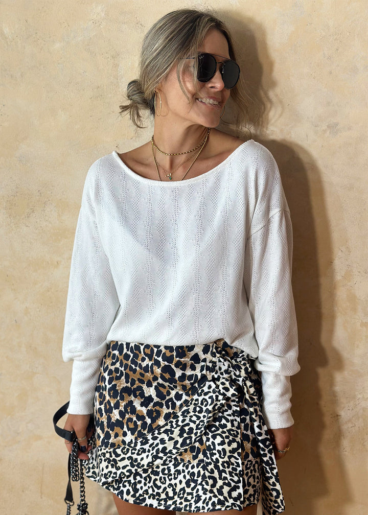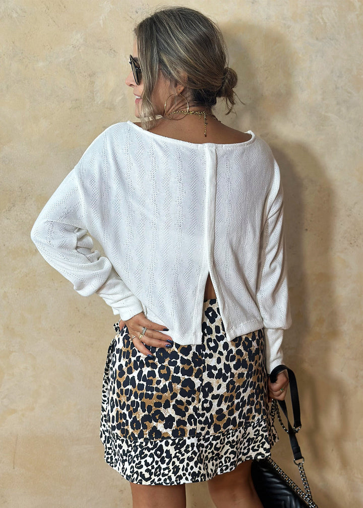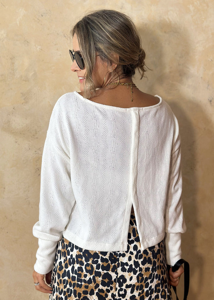 Buzo en tejido de punto color marfil. Cuello redondo, maga larga con puño ancho, y espalda con perilla en centro y abertura en inferior.