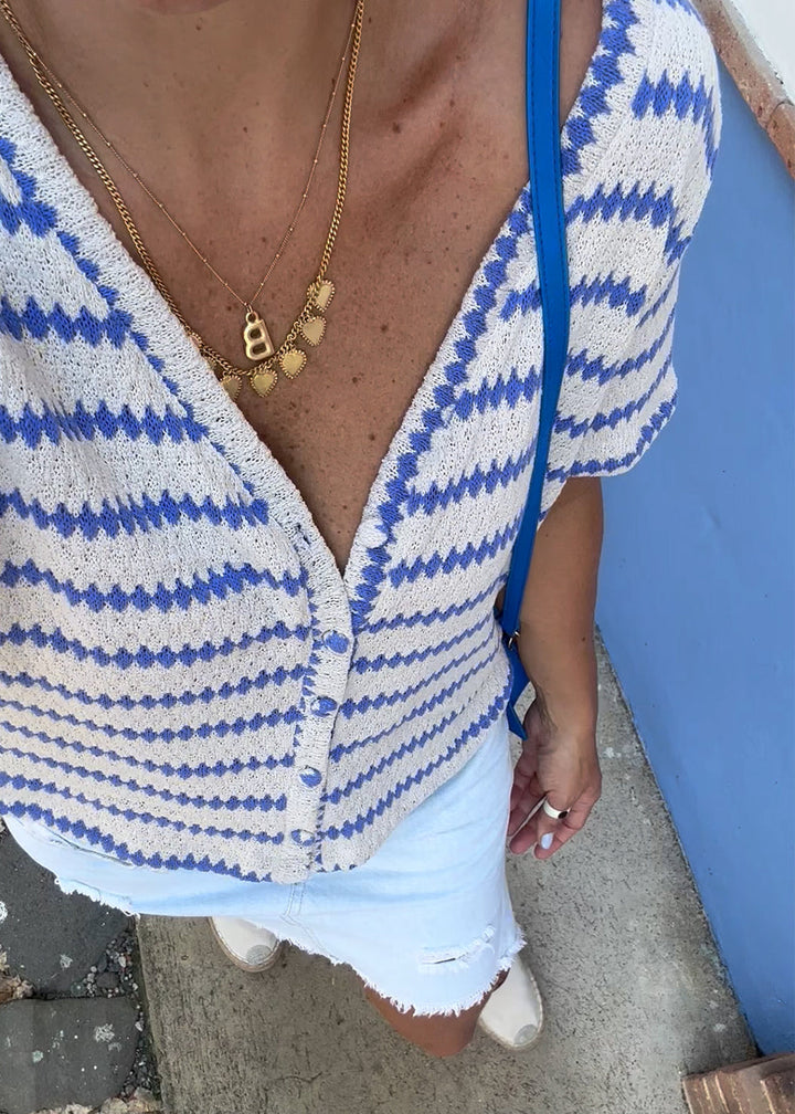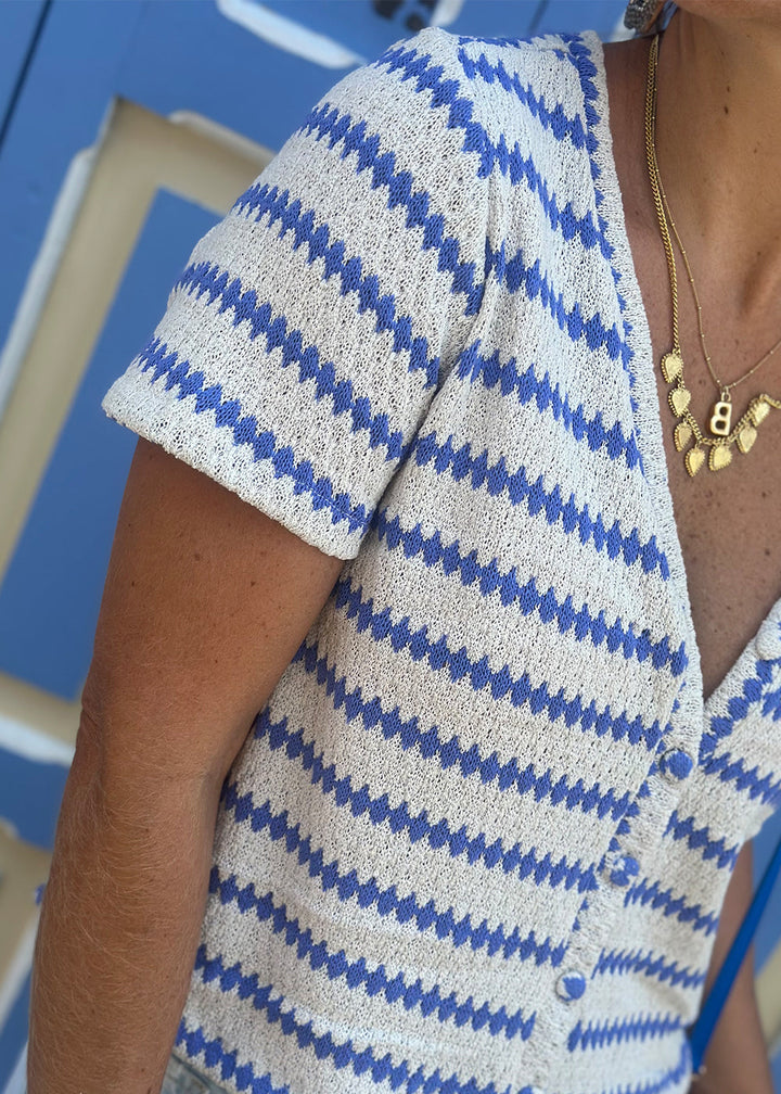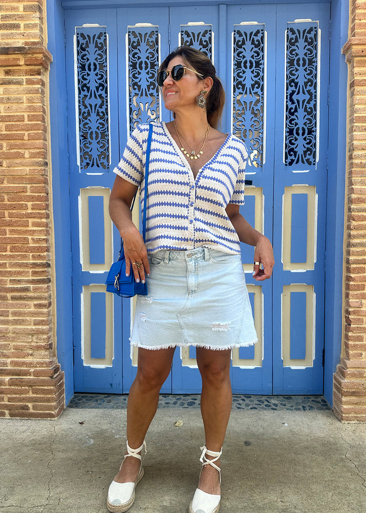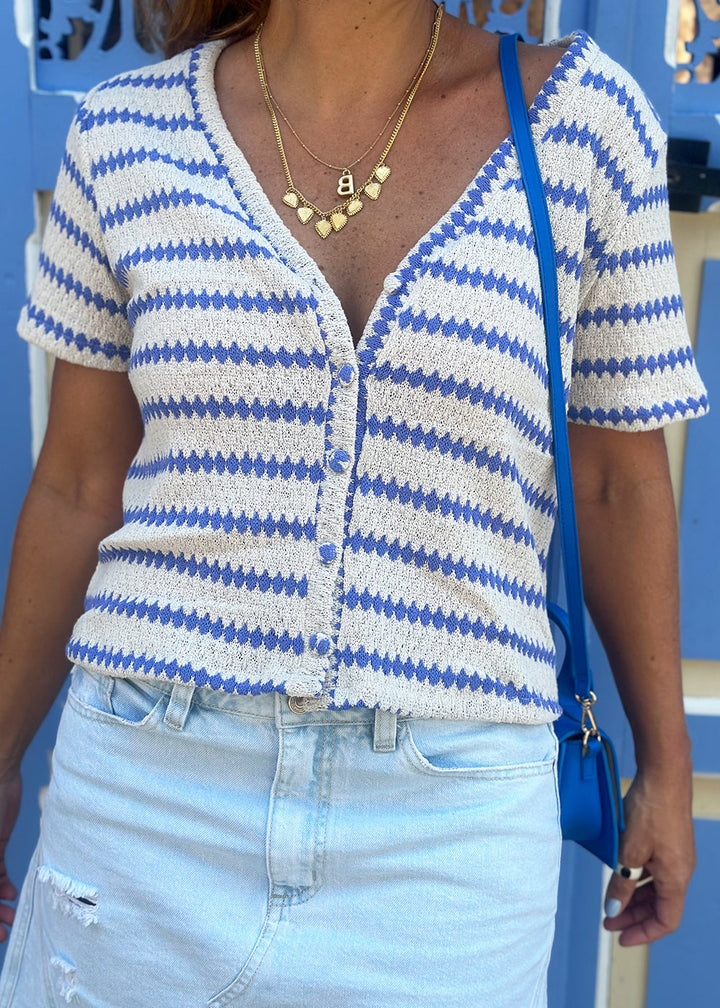 Blusa en tejido crochet beige con diseño horizontal en color azul. Escote en V en frente con botones forrados en perilla. Manga corta.