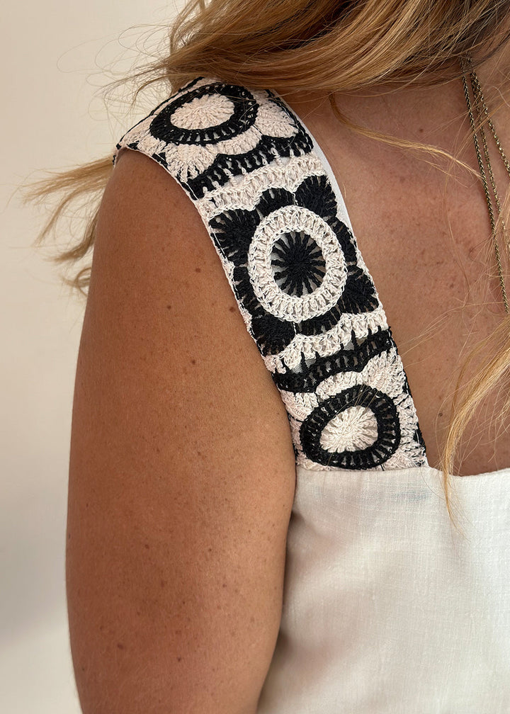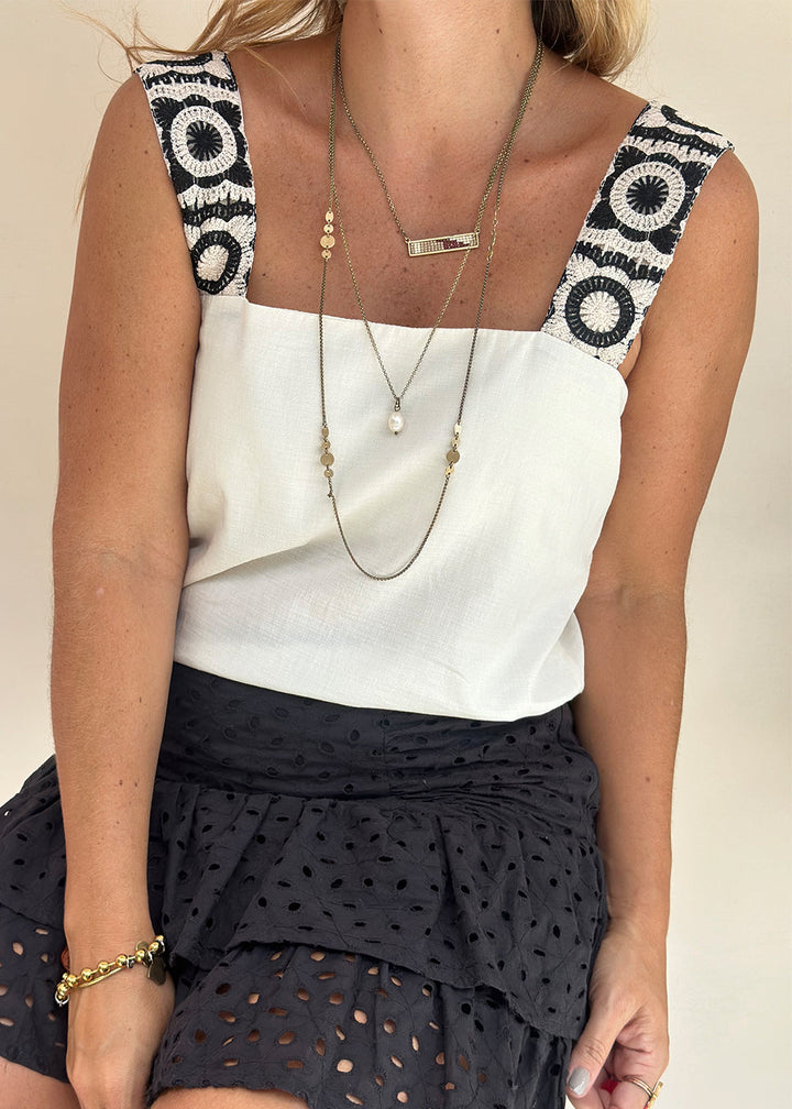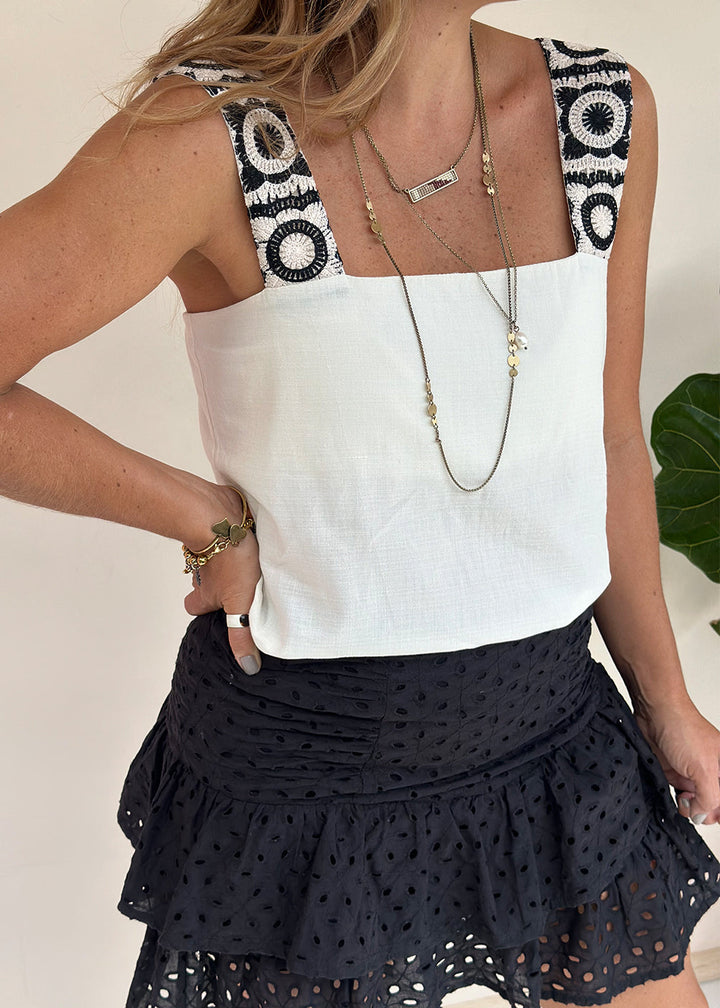 Blusa en imitación lino color marfil. Cargaderas en tejido crochet, escote cuadrado y elástico interno en posterior y ruedo de top interno. Lleva cajas en laterales Silueta semi ajustada