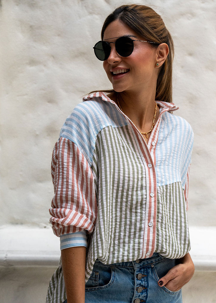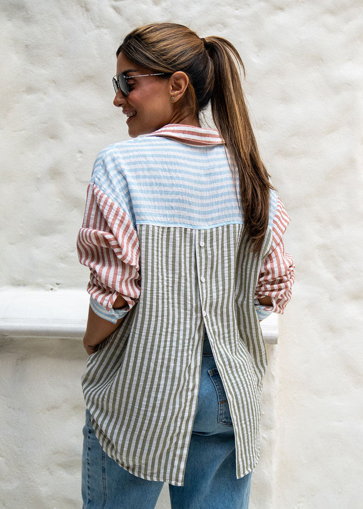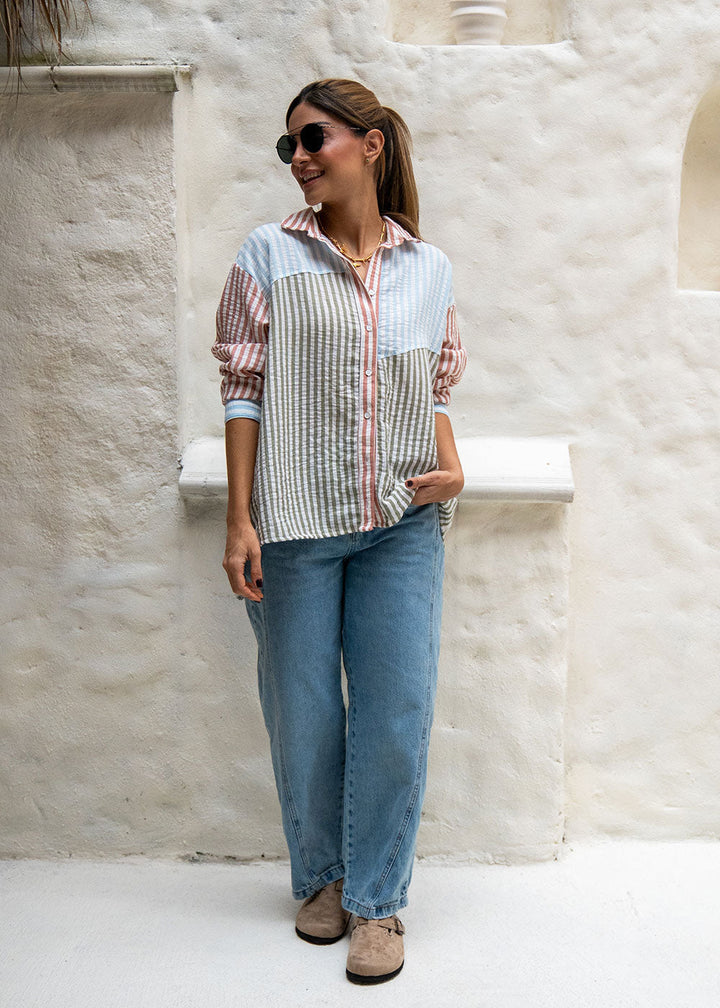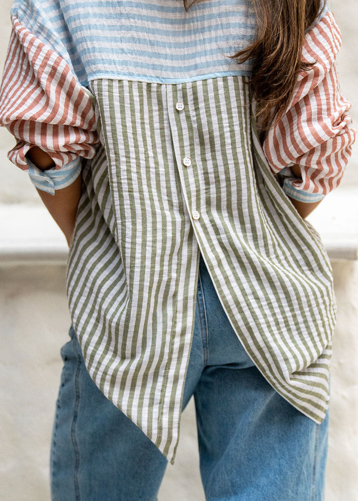 Camisa en efecto Lino en mix de rayas . Manga larga, cuello con banda y perilla con botones, cortes asimétricos en delantero y en posterior lleva almilla con perilla en centro y botones.