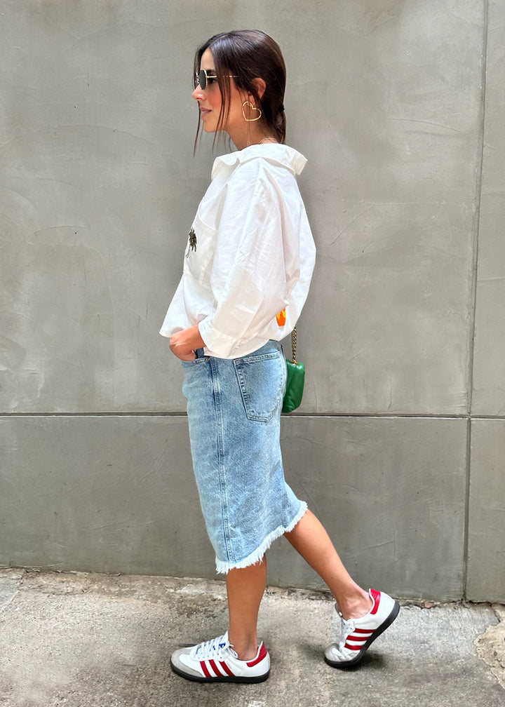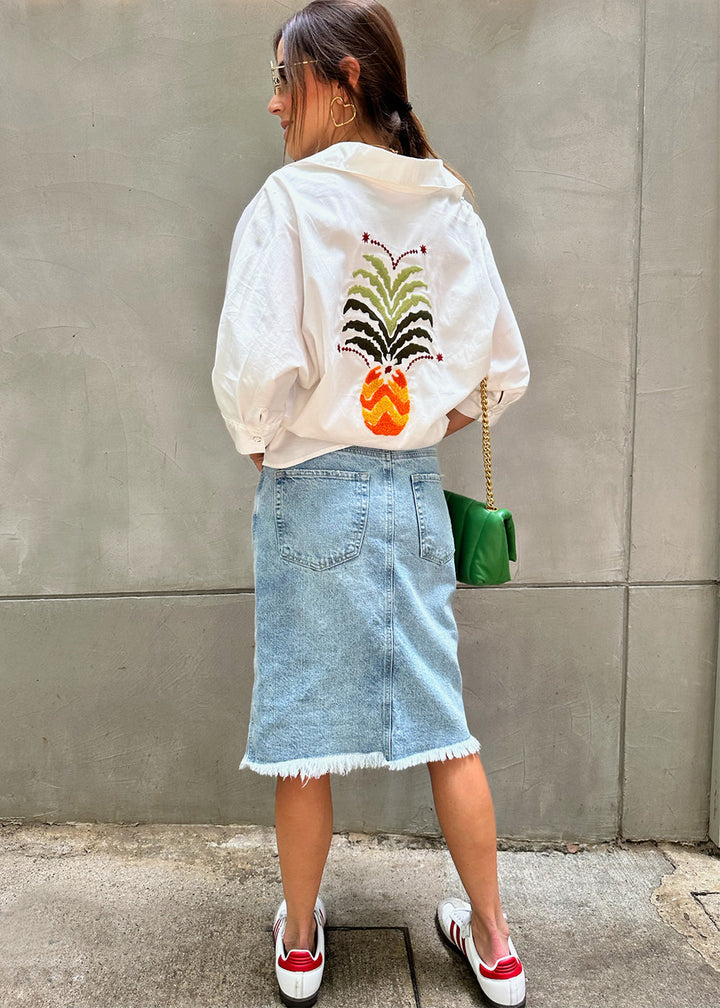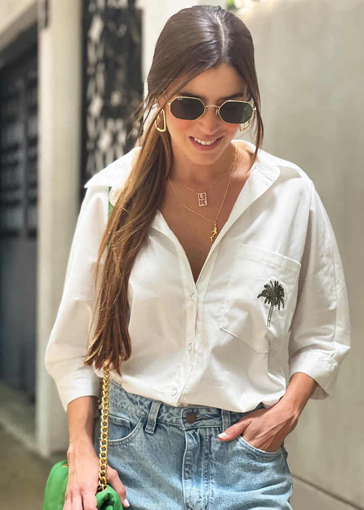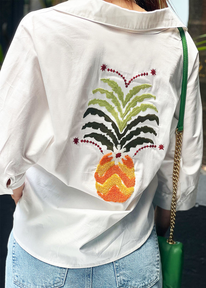 Camisa en popelina color marfil. Cuello con banda y perilla con botones, bolsillo con bordado de palmera en frente, espalda con bordado Chenil de piña y mangas 3/4 con botón.