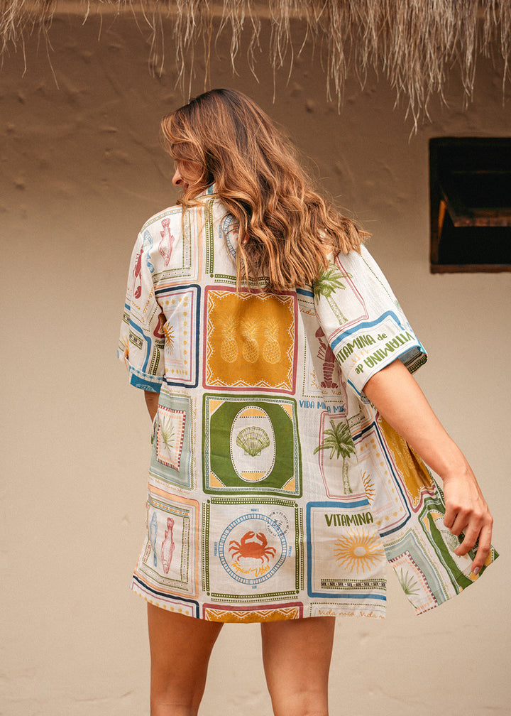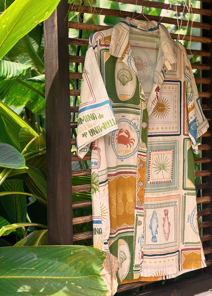 Camisa en efecto lino estampado. Manga corta con guarda polvo, cuello y perilla con botones. Lleva bolsillos funcionales y cajas en laterales.