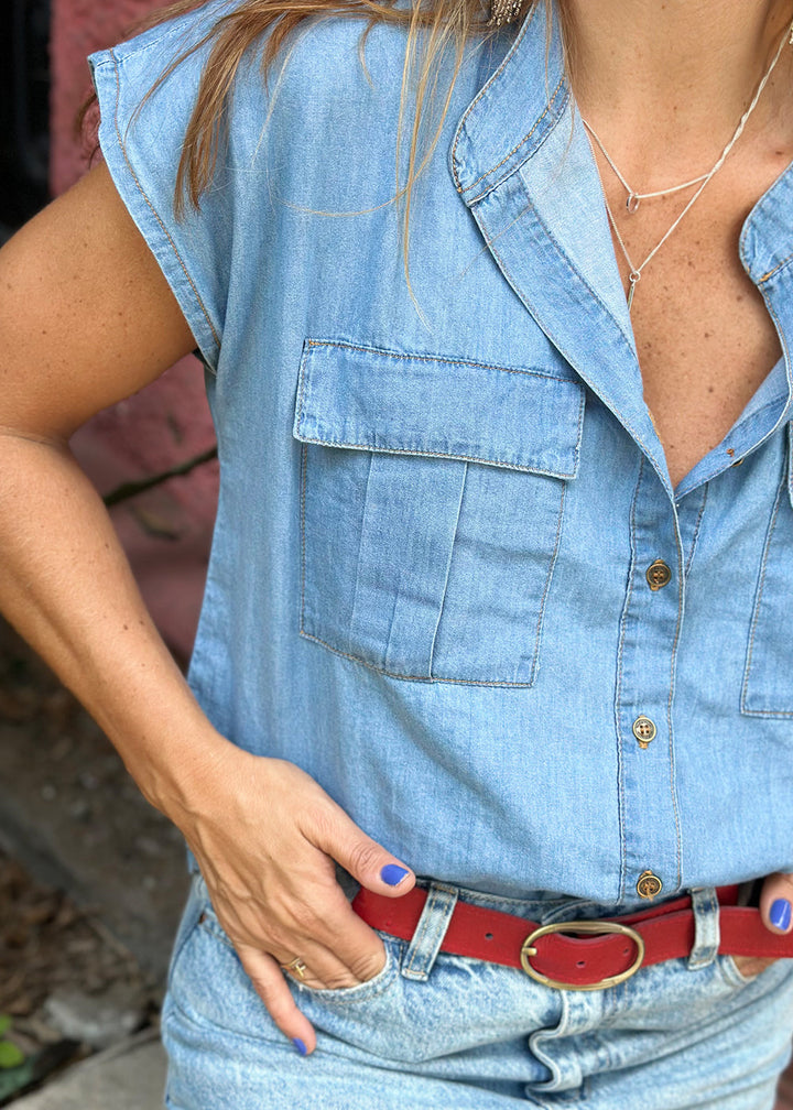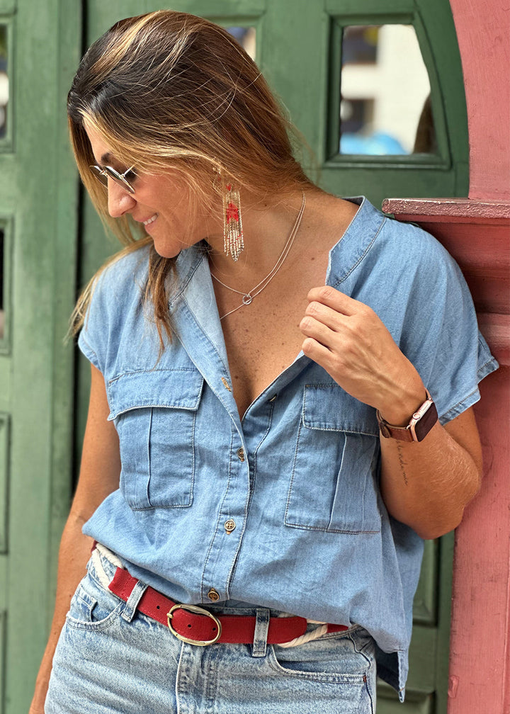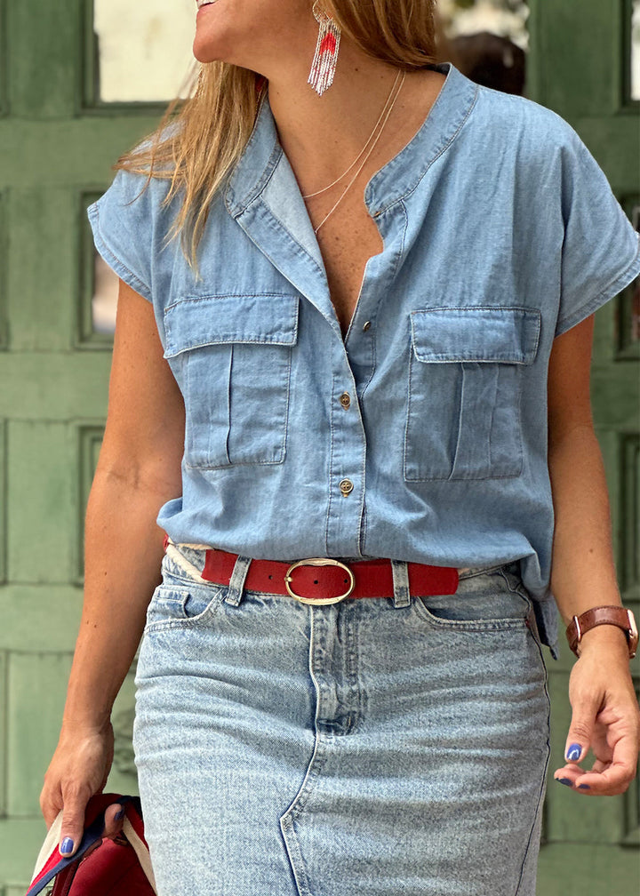 Camisa en Chambray color azul. Cuello Neru, manga rodada, perilla con botones, bolsillos con tapas en frente y cajas en laterales.