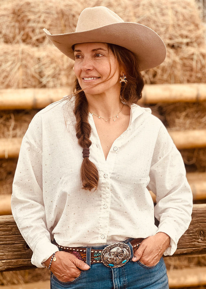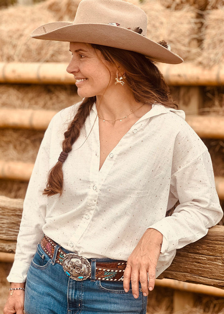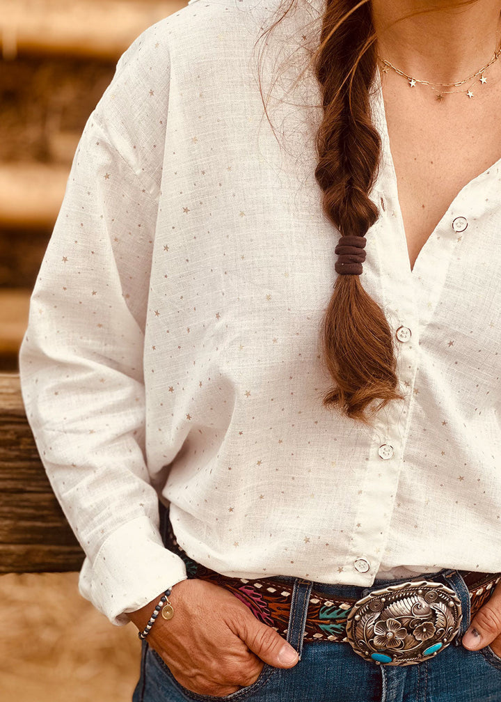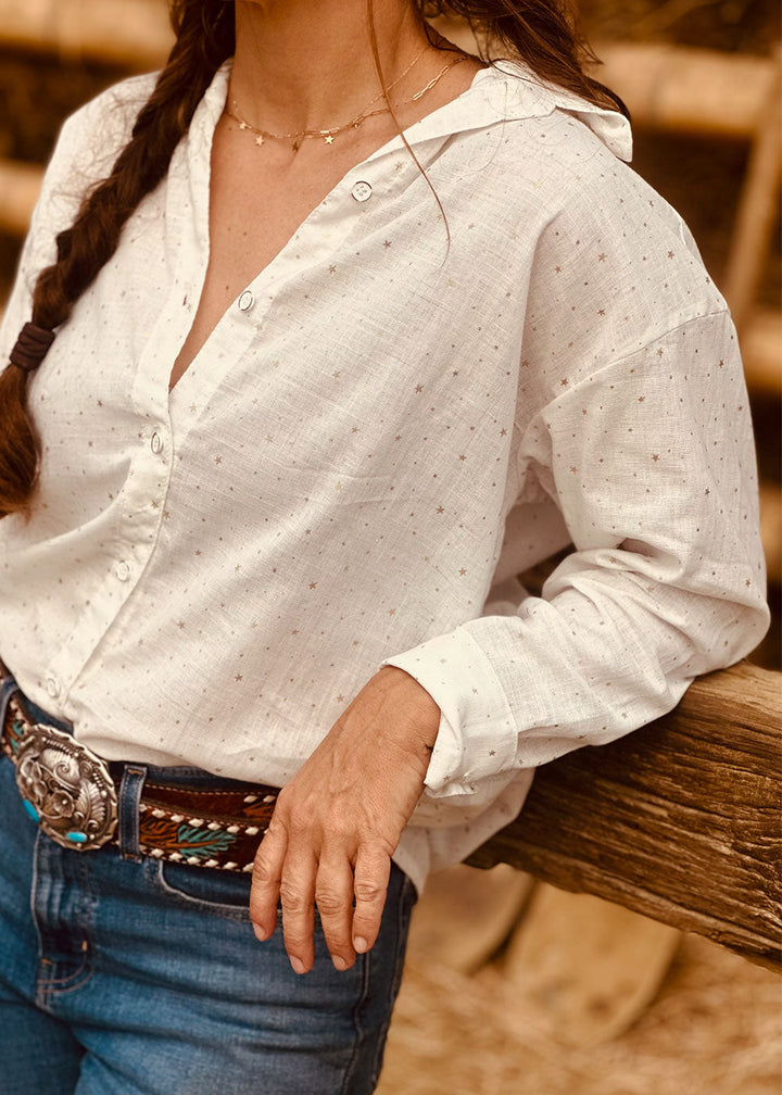 Ivory linen-effect shirt with golden star details. Features long sleeves, a band collar, a button placket, and buttoned cuffs.