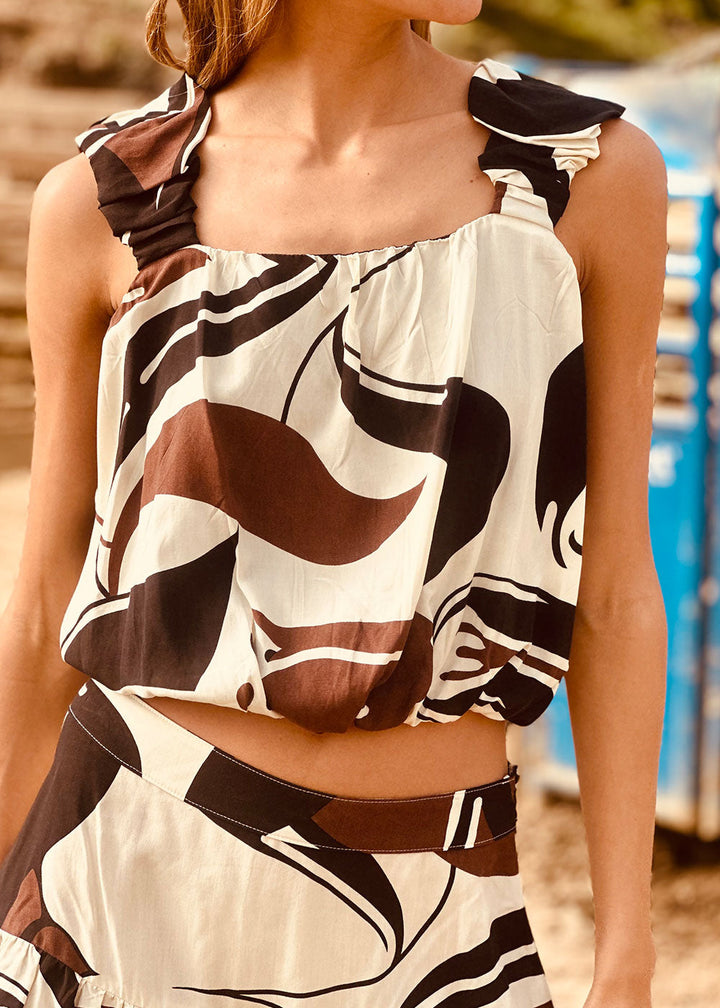 Balloon-style blouse in challis fabric with a tonal print. Features elasticated straps with gathered details and a ruched design at the waist for a puffed effect.