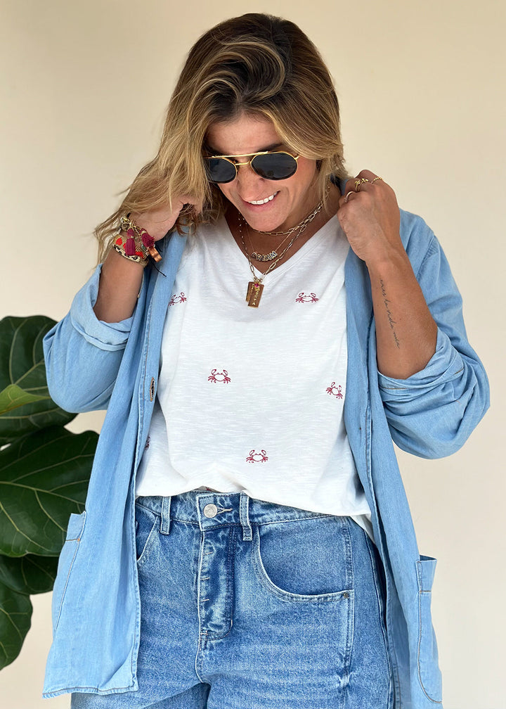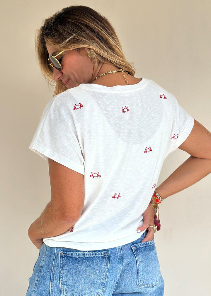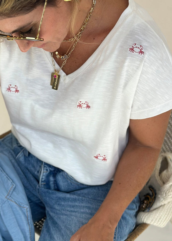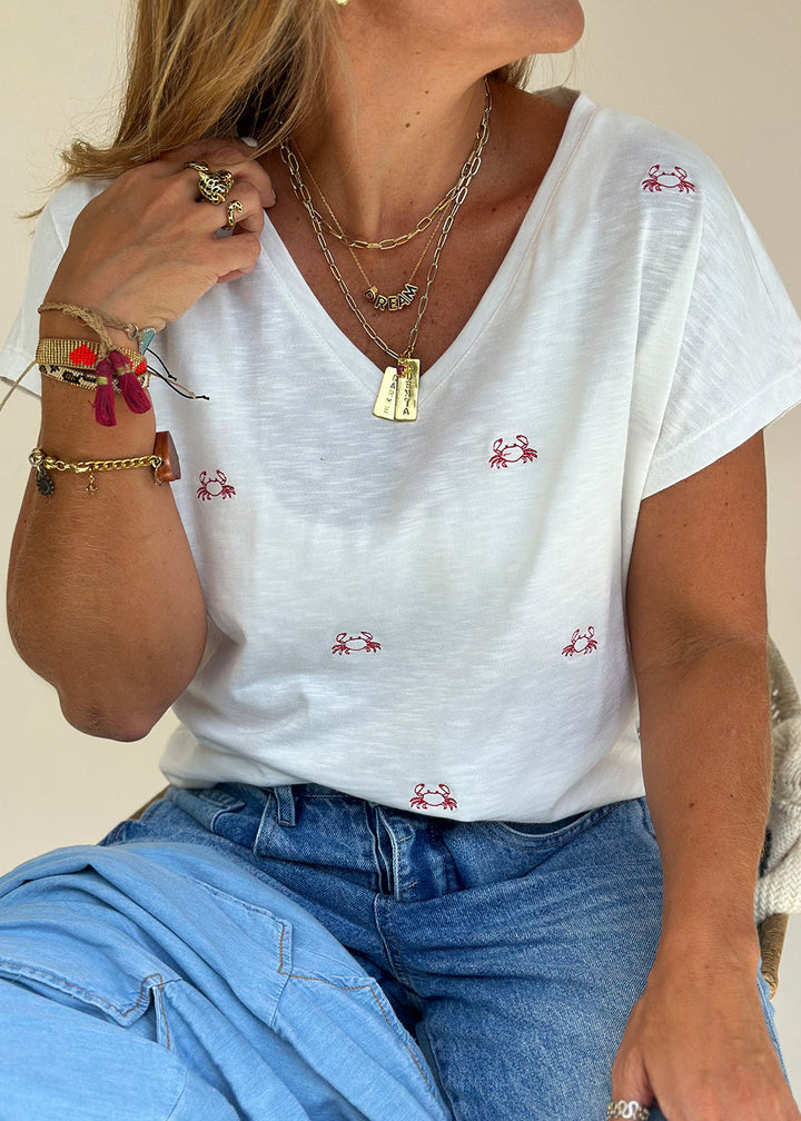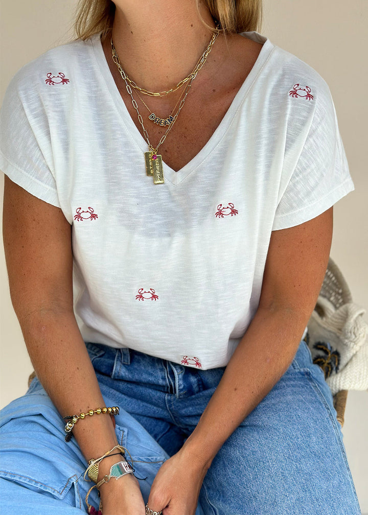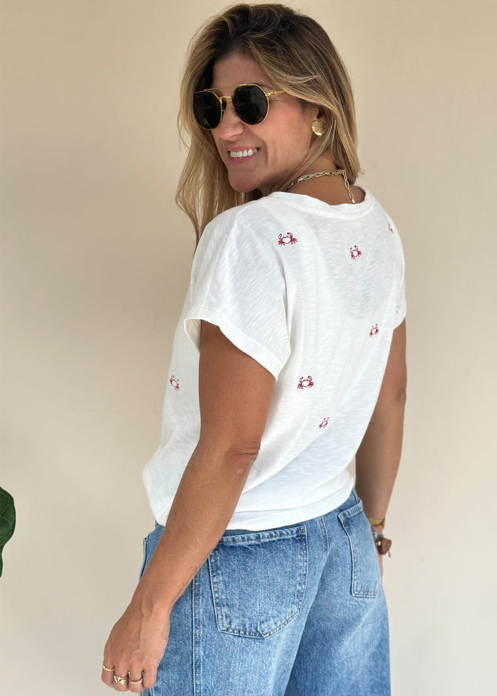 Camiseta en tejido de punto marfil con bordado de cangrejos rojos. Cuello en “V” en frente y hombro caído.