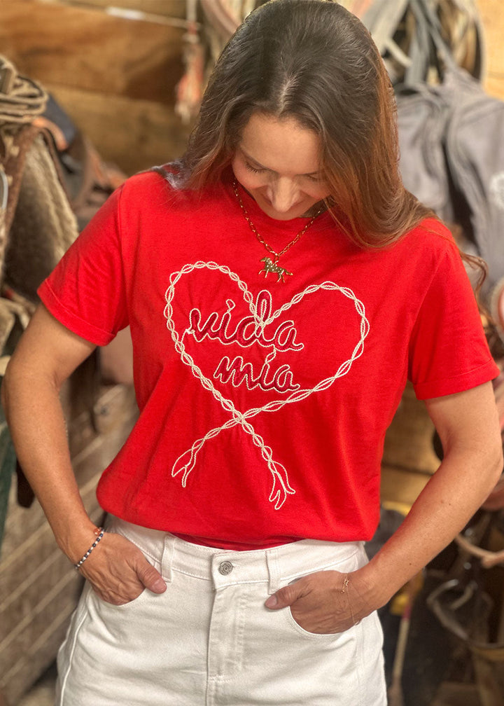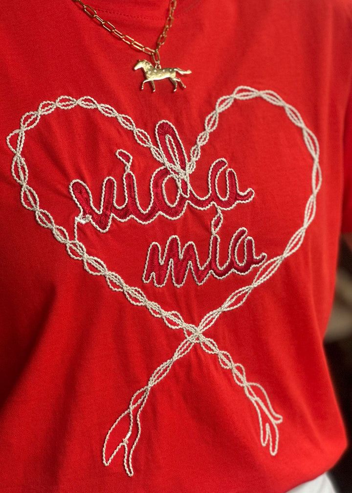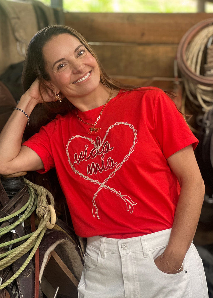 Red knitted fabric t-shirt. Short sleeves with cuffs, round ribbed neckline, and heart-shaped embroidery with cord on the front center.
