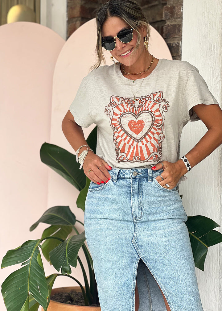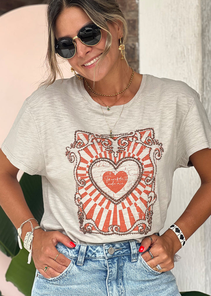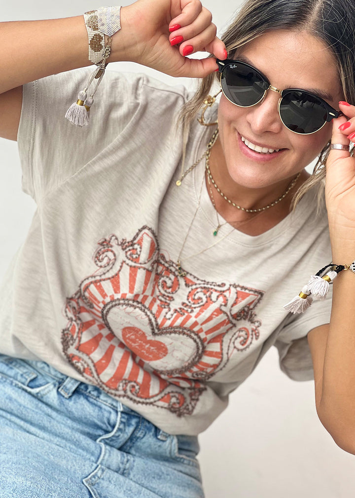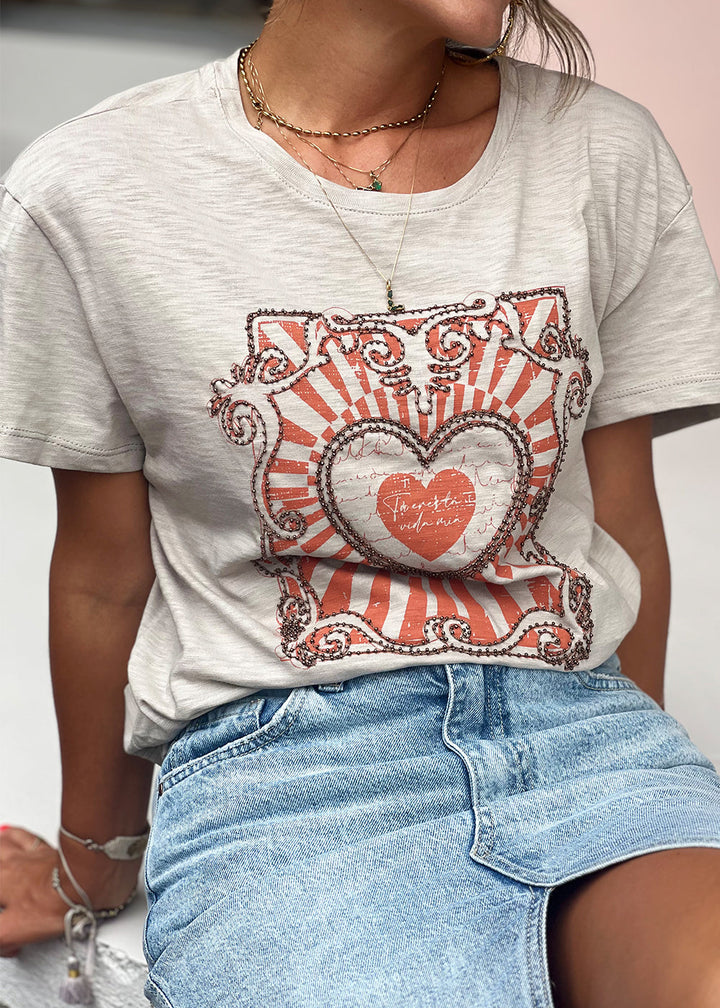 Camiseta en tejido de punto color camel con estampado y manualidad en mostacilla en centro frente. Escote redondo.