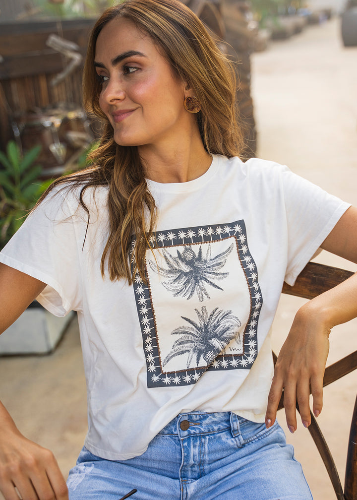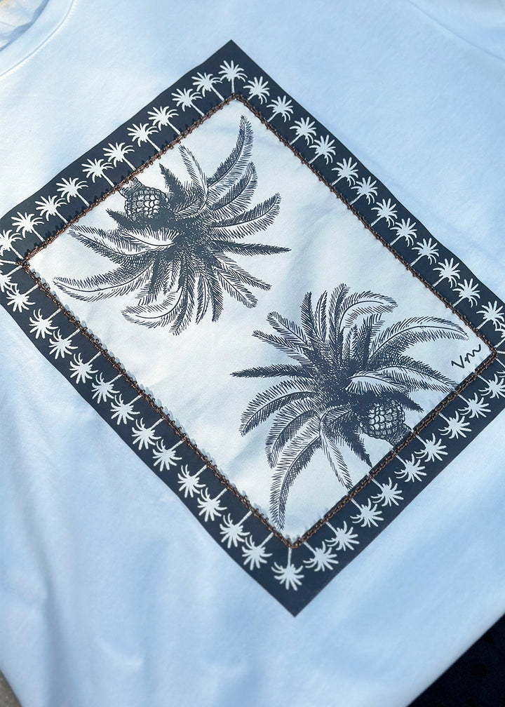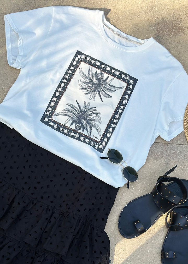 Camiseta en tejido de punto color marfil con estampado y manualidad en mostacilla en centro frente. Escote redondo.