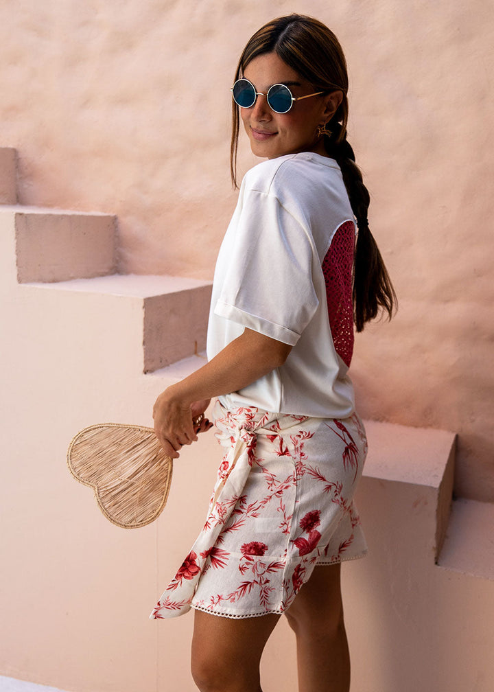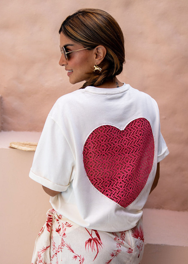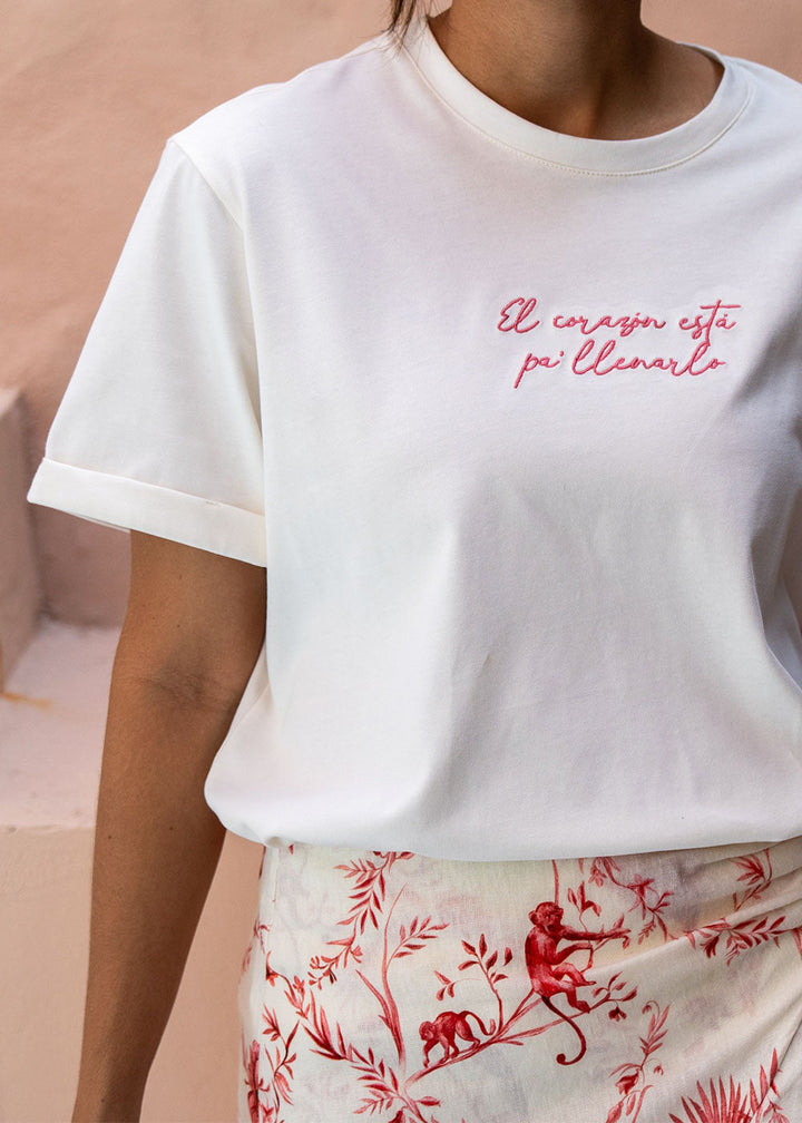 Camiseta en tejido de punto color marfil con bordado de texto en frente y corazón en tejido en espalda. Cuello redondo en rib y manga corta con guardapolvo