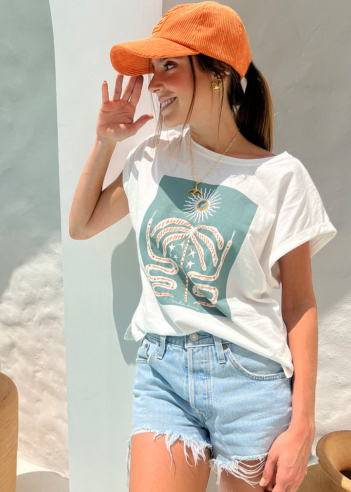 Camiseta en tejido de punto marfil con estampado/bordado de culebras en frente. Escote redondo, hombro caído, guardapolvo en puños y cajas en laterales.
