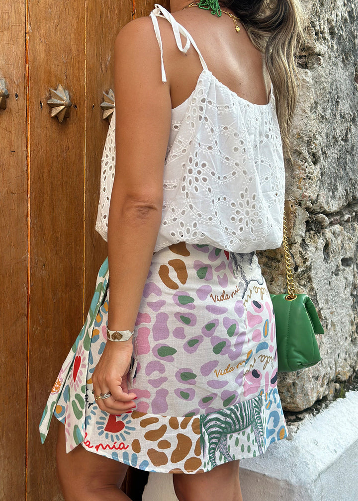 Short linen-effect skirt with a subtle animal print. Features an overlay with a ruffle at the hem, ties for adjustment on the side, and a zipper at the center back.