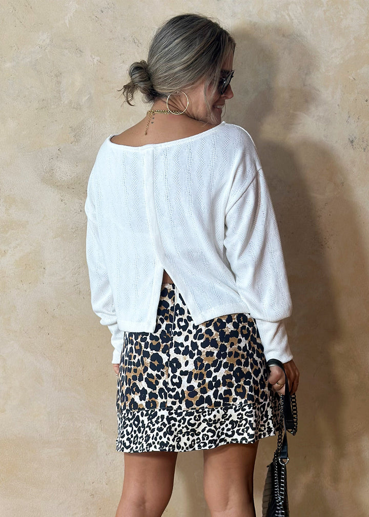 Falda corta en chalis con estampado fondeado en print. Lleva corte sobrepuesto con bolero en ruedo, tiras para amarrar en lateral y cremallera en centro posterior.