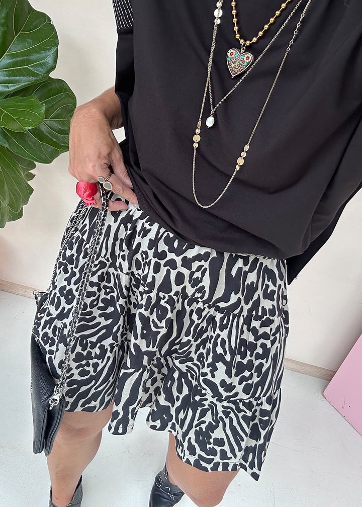 Falda corta en Chalis con estampado fondeado en animal print. Pretina con elástico, cortes con recogido y bolsillos funcionales en laterales.