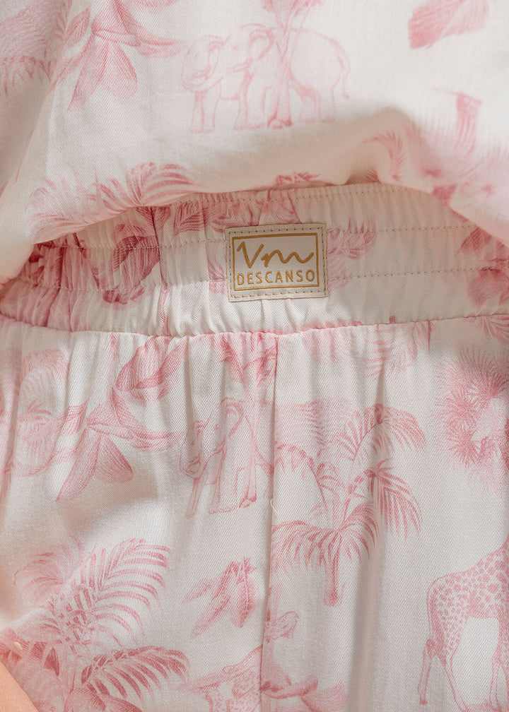 La Pijama Gaspar es un set en chalis con estampado fondeado lleno de movimiento y color. La blusa lleva tiras con tensores ajustables y vivos en contraste azul que resaltan el escote. El pantalón cuenta con pretina ancha y elástico interno, bolsillos laterales y cortes en botamangas con vivo azul, creando un look armonioso y moderno.
