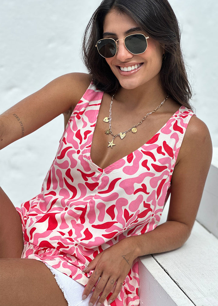 Chalis blouse with a faded print. Sleeveless, "V" neckline in the front and back, and ruffled hem. The back neckline has crossed bias tapes.