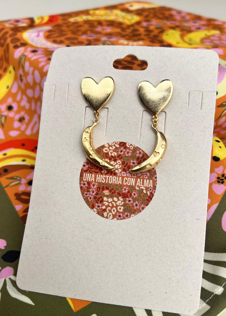 Topos de corazón con pendientes de los icónicos bananos de la colección. Una combinación tropical, divertida y hermosa. Fabricados en Zamak con baño de oro de 24k.