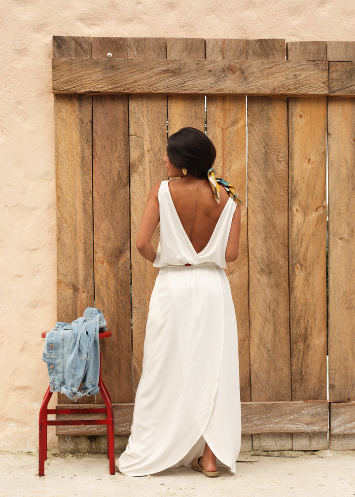 Long chalis dress in ivory color. Cross front neckline and "V" back, sleeveless, elastic waist, functional pockets on the sides. The skirt has overlapping cuts in the front. Semi-fitted silhouette.