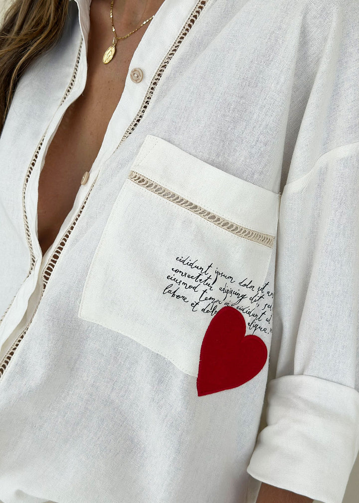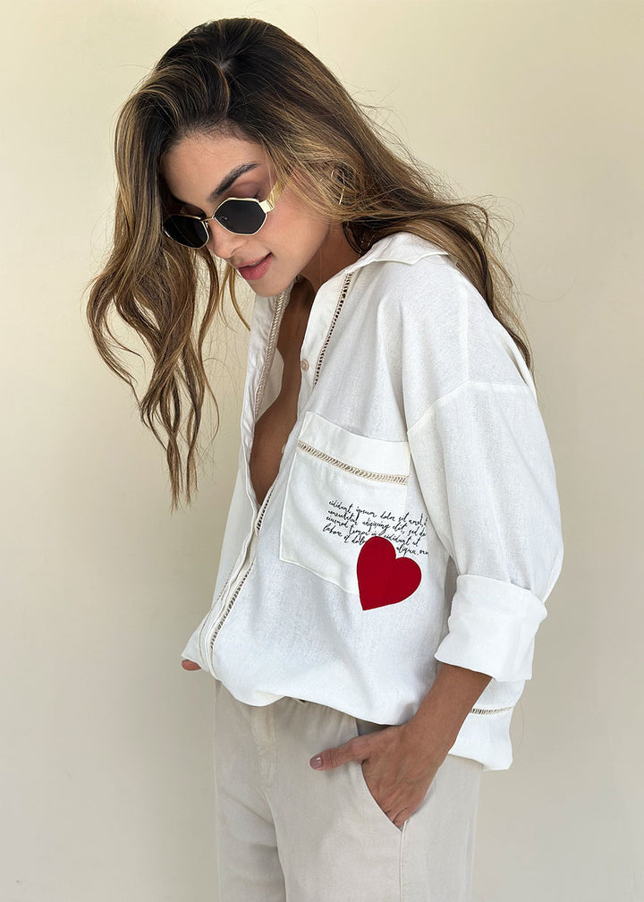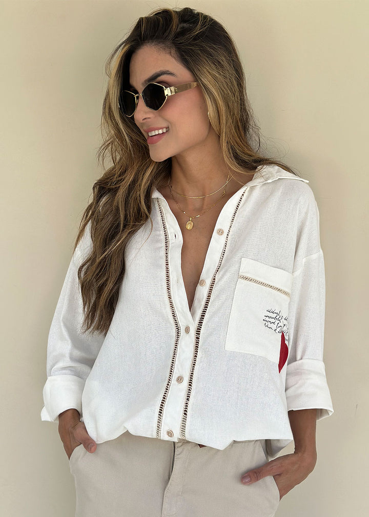 Camisa de manga larga en lino color marfil con delicados bordados y entredos en frente y espalda. Diseño con cuello camisero y perilla con botones, ideal para looks femeninos y frescos de día o escapadas tropicales.