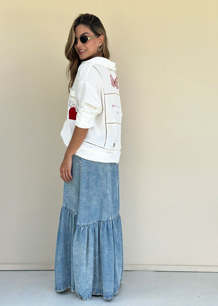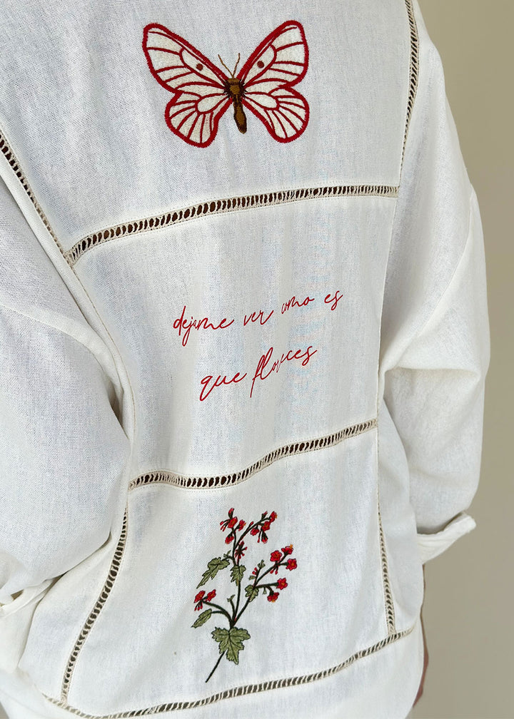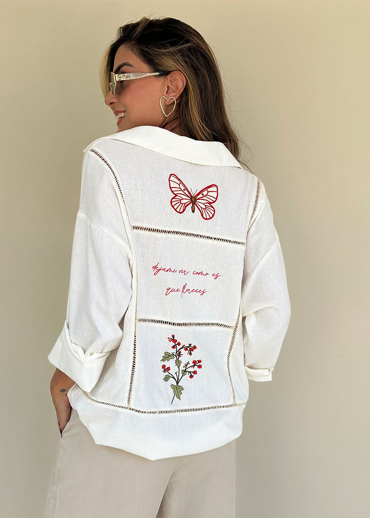 Camisa Manga Larga en Lino con Bordados y Entredos - Caléndula