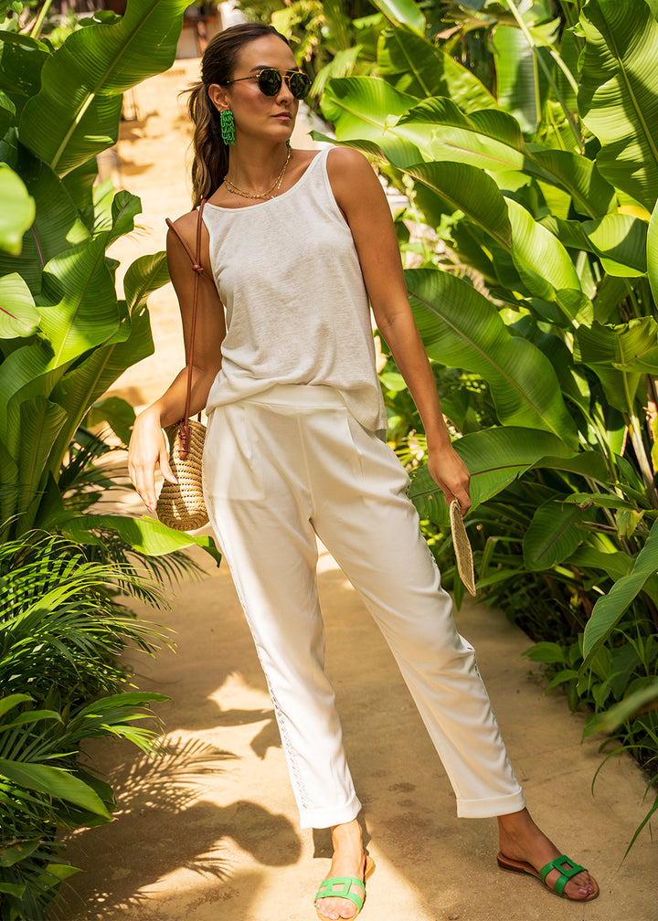 Pantalón en efecto Lino color marfil con detalle de bordados en los laterales. Pretina con elástico en posterior, bolsillos funcionales y botas con guardapolvo.