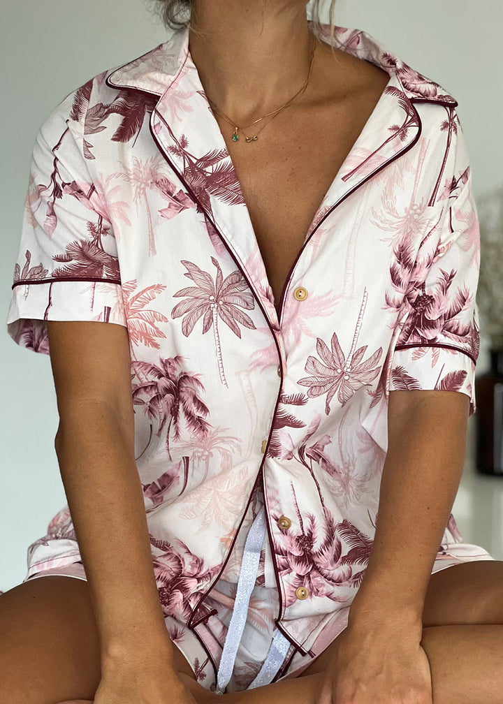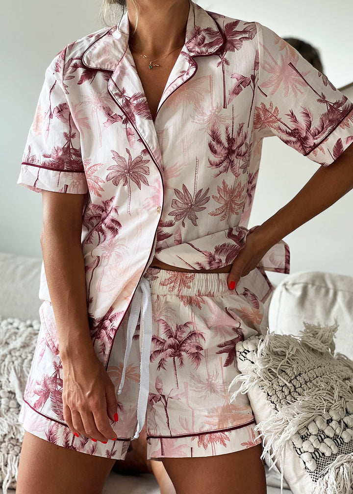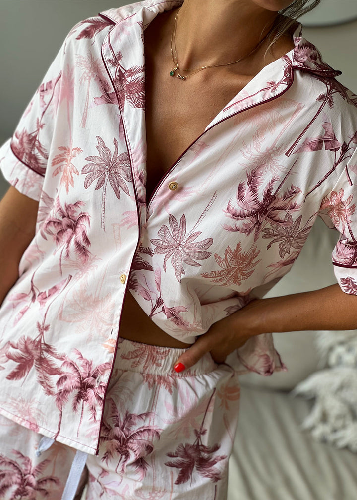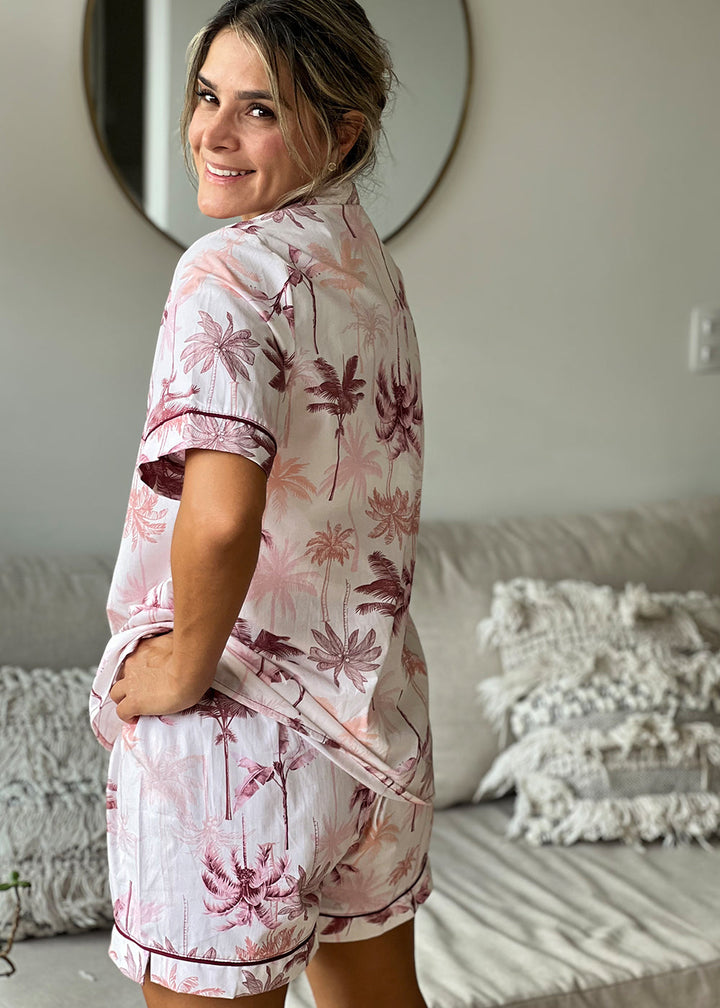 Pijama en popelina con estampado fondeado de palmeras. Camisa con vivo color vinotinto en contorno de cuello y perilla con botones; manga corta con vivo vinotinto y cajas en laterales. Short con pretina ancha y elástico interno con tira de amarre en lurex plateado, además, lleva vivo Vinotinto en las botas.