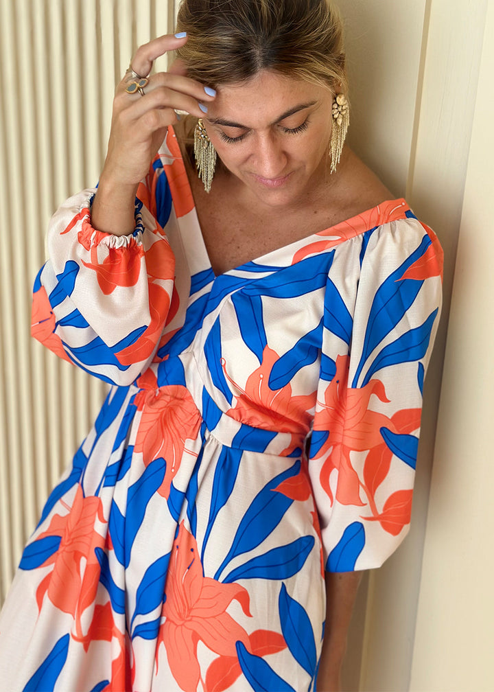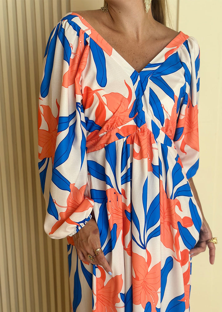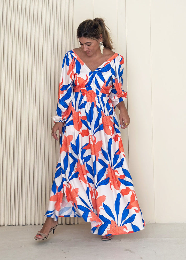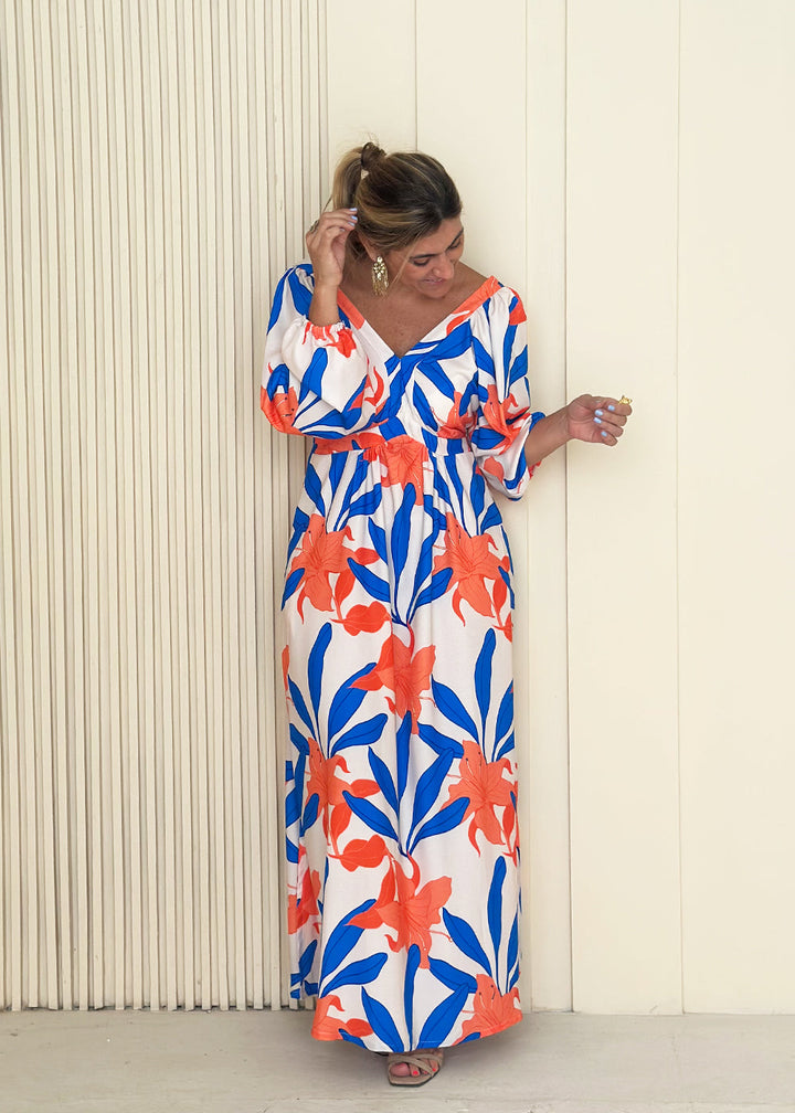 Maxi dress in faux Chalis with a faded print. Deep V-neckline in the front and back, long sleeves with shoulder gathering and elastic cuffs. Smocked waistband at the back and side slits. Semi-fitted silhouette.