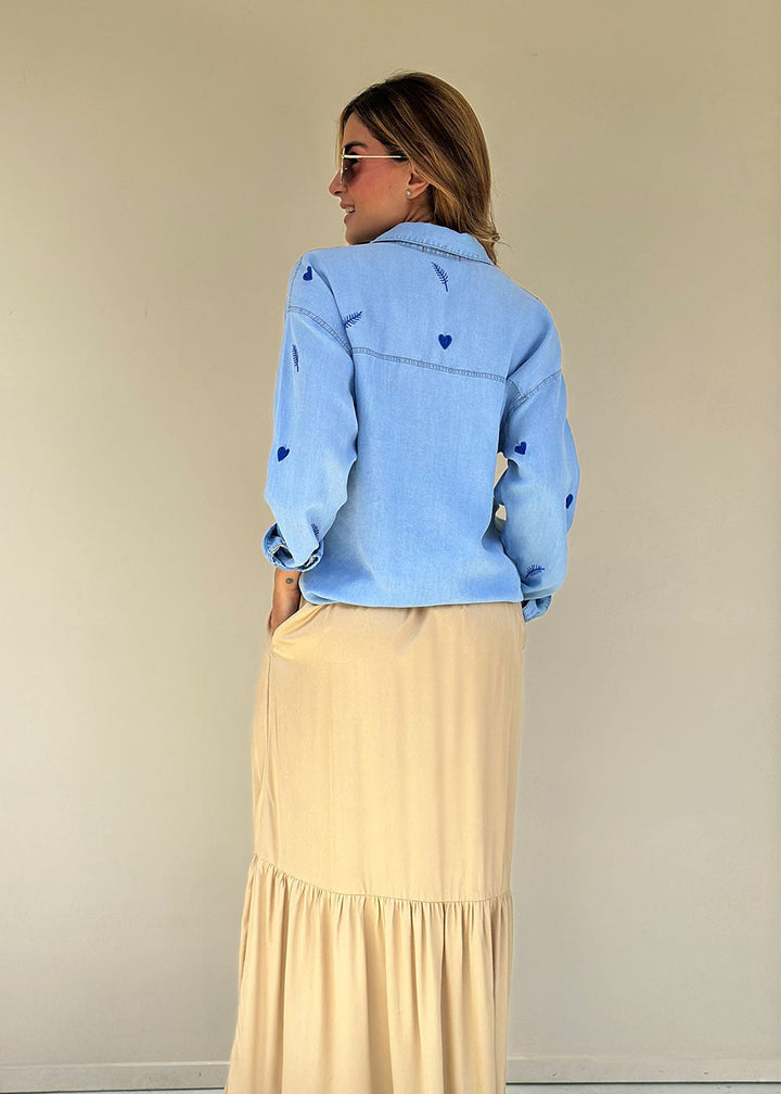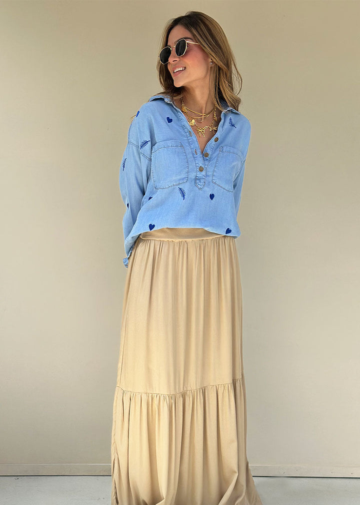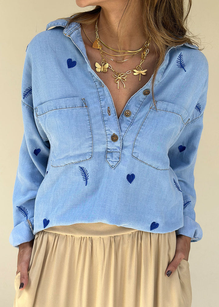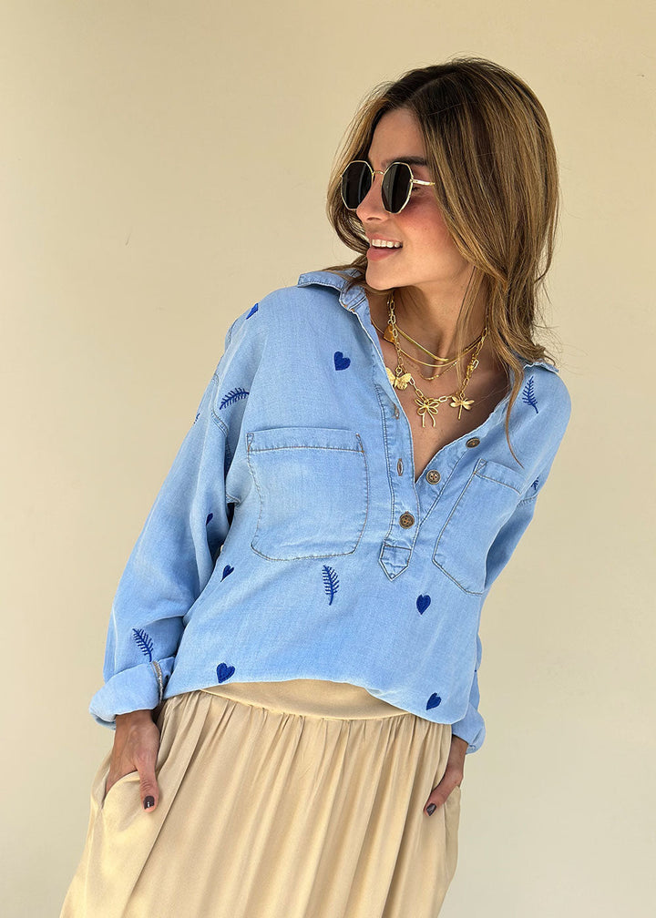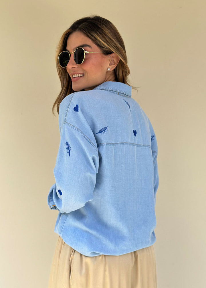 Una pieza fresca y sofisticada confeccionada en tencel con delicados bordados. Presenta cuello clásico con perilla corta de botones, mangas largas con puños ajustables, bolsillos funcionales en el frente, almilla posterior y pliegues laterales que aportan fluidez. Ideal para un look relajado pero elegante.