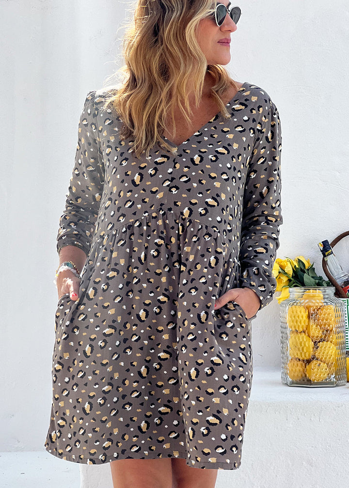 Vestido corto con estampado fondeado print. Escote en "V" en delantero y posterior con sesgo horizontal para sujetarlo, corte en cintura con recogido, manga larga con elástico en puños y bolsillos funcionales en laterales.