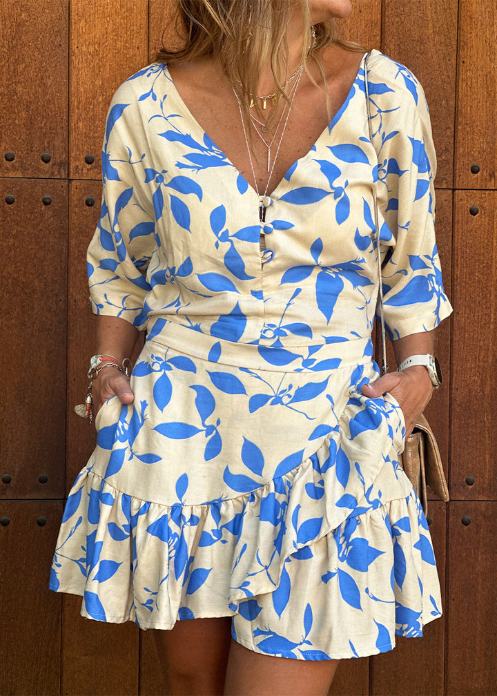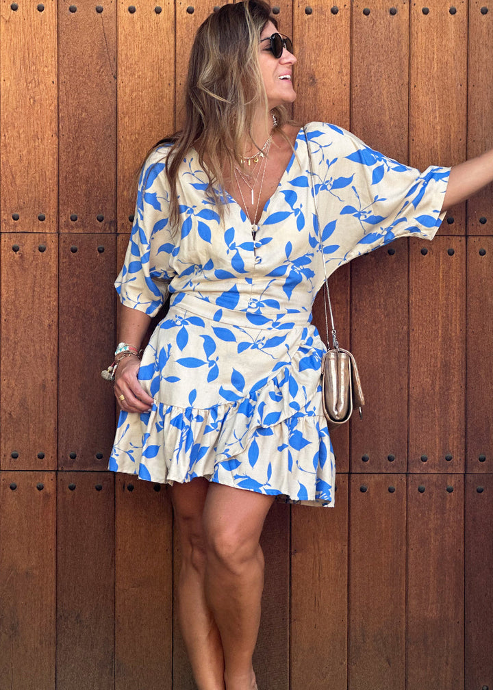 Vestido corto en chalis con estampado fondeado. Escote en "V" en delantero con botones forrados sobrepuestos, mangas con hombros caídos, pretina con elástico en posterior, falda corta con cortes y boleros sobrepuestos.