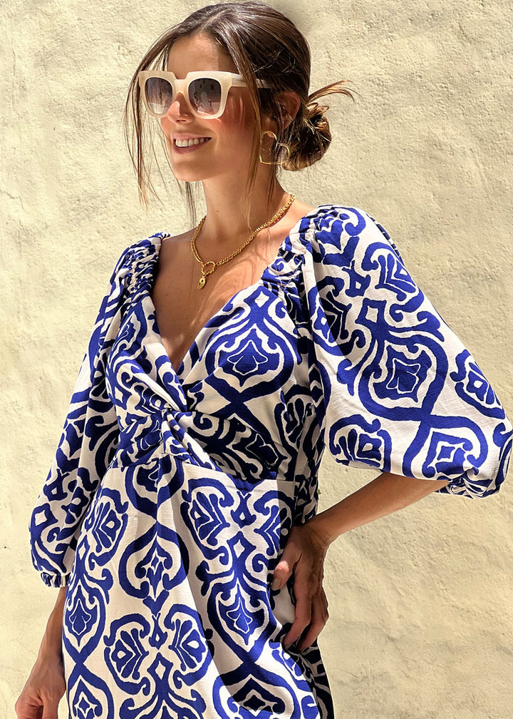 Vestido corto en falso Chalis con estampado fondeado. Mangas globo con elástico en cargaderas, nudo en escote frente y cremallera en costado.