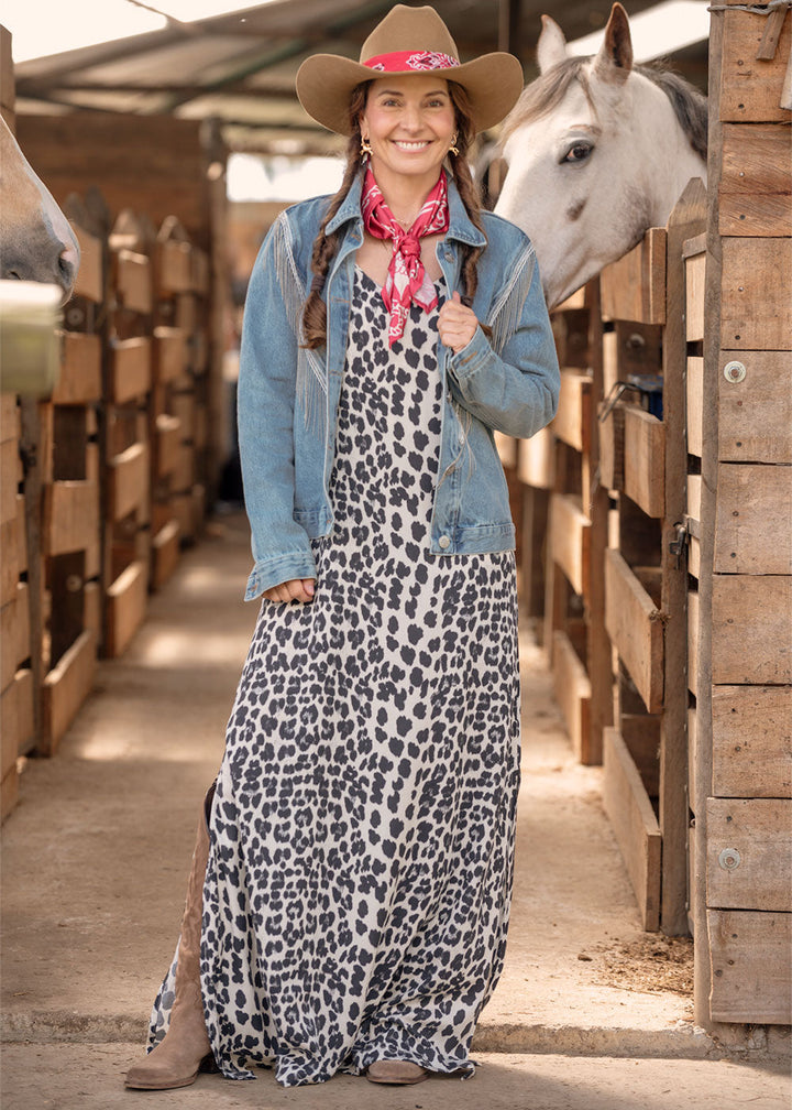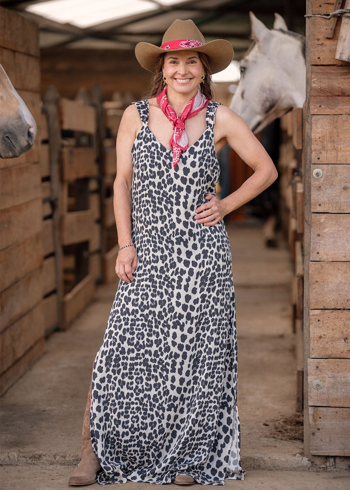 Long dress in challis fabric with a tonal print. V-neckline at the front and back, wide straps with gathering at the join, functional pockets, and box pleats on the sides.