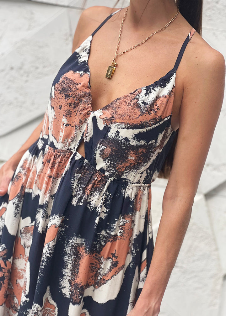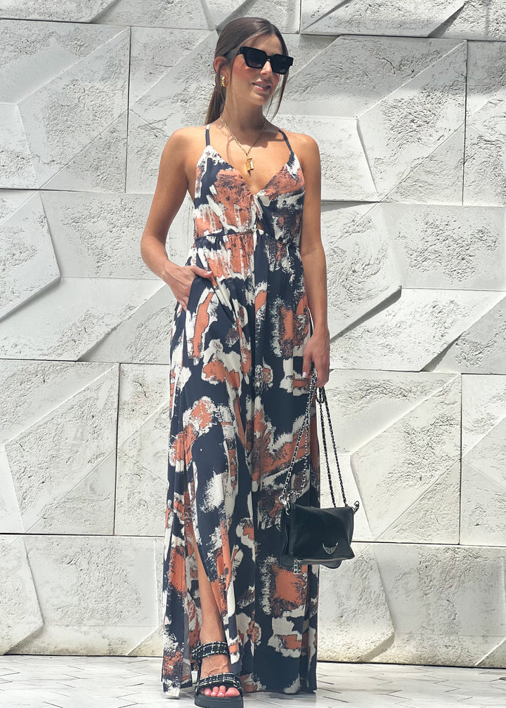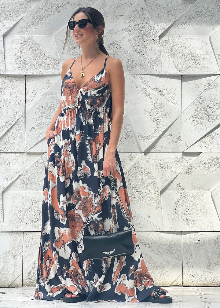 Vestido largo en Chalis estampado, Escote profundo con recogido en copas y espalda con abertura que une con tiras libres de amarre. Lleva corte en cintura con elástico interno haciendo recogido, bolsillos funcionales en laterales y cajas en parte inferior de la falda.