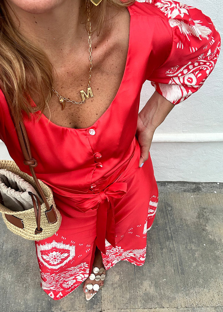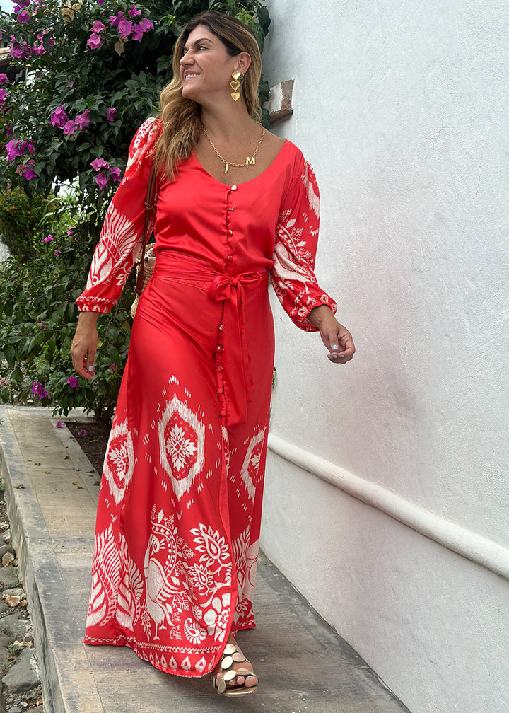 Vestido largo en satín color rojo. Escote profundo en frente con botones forrados en perilla, mangas largas con elástico en puños y fajón ancho para amarrar en cintura.