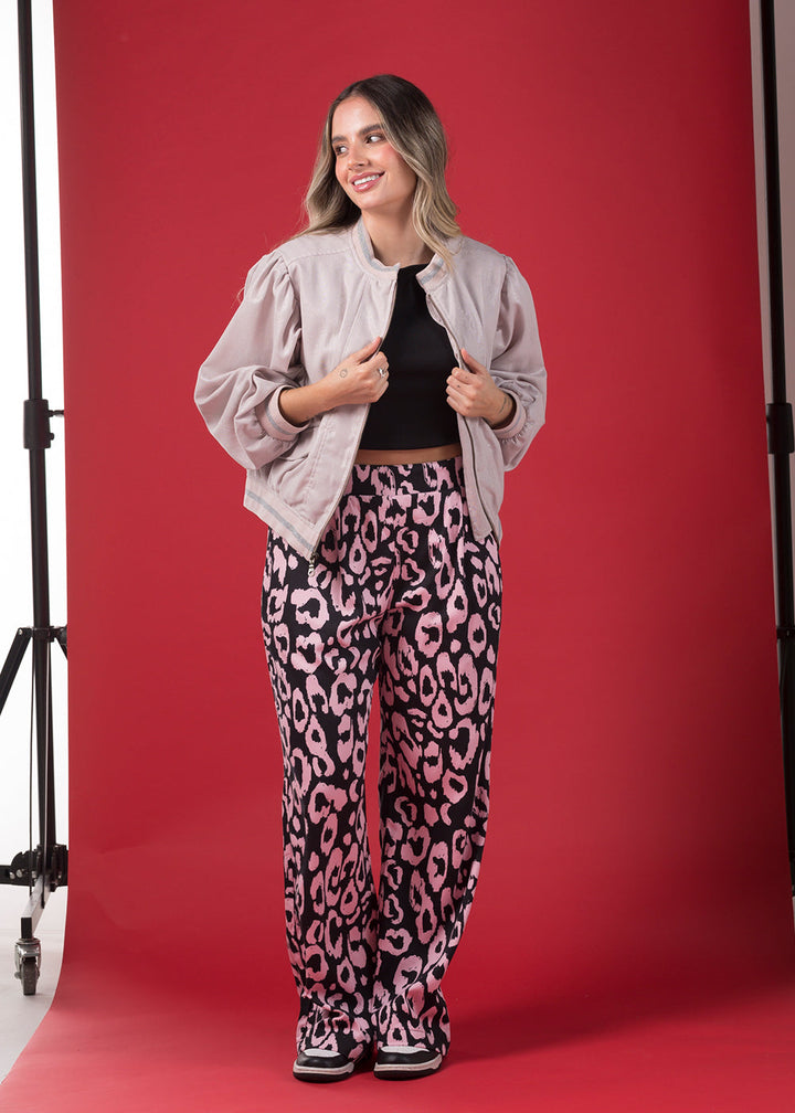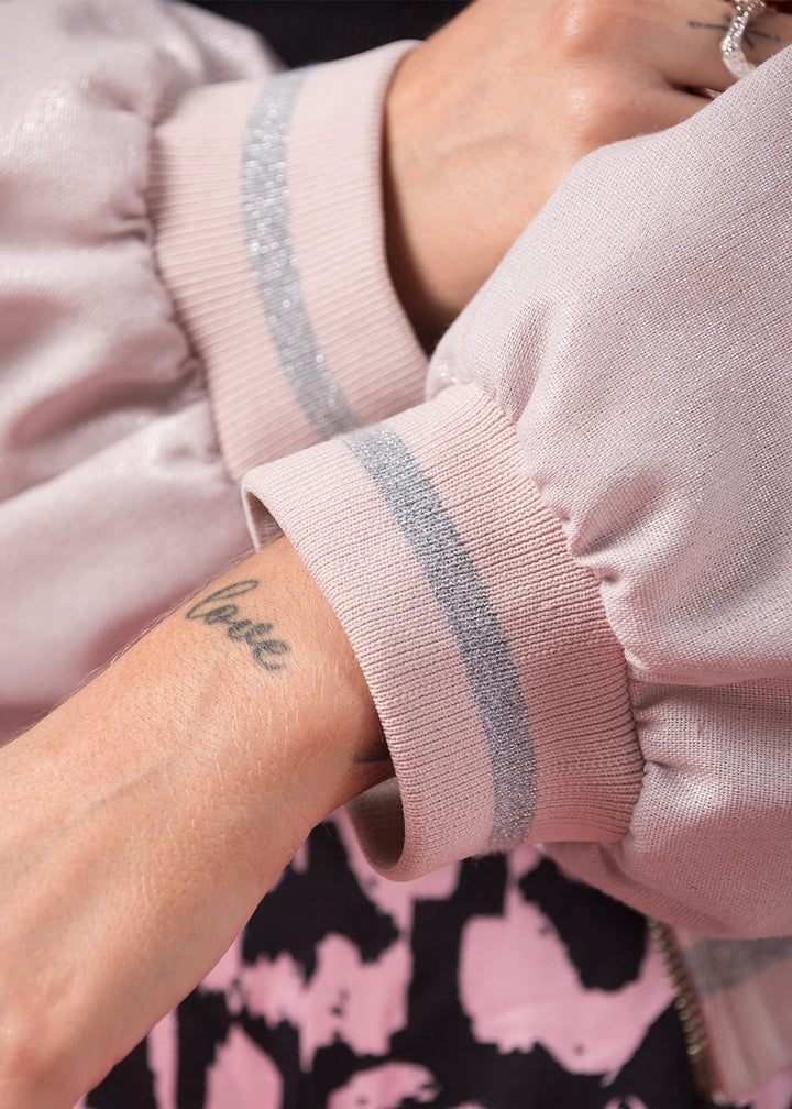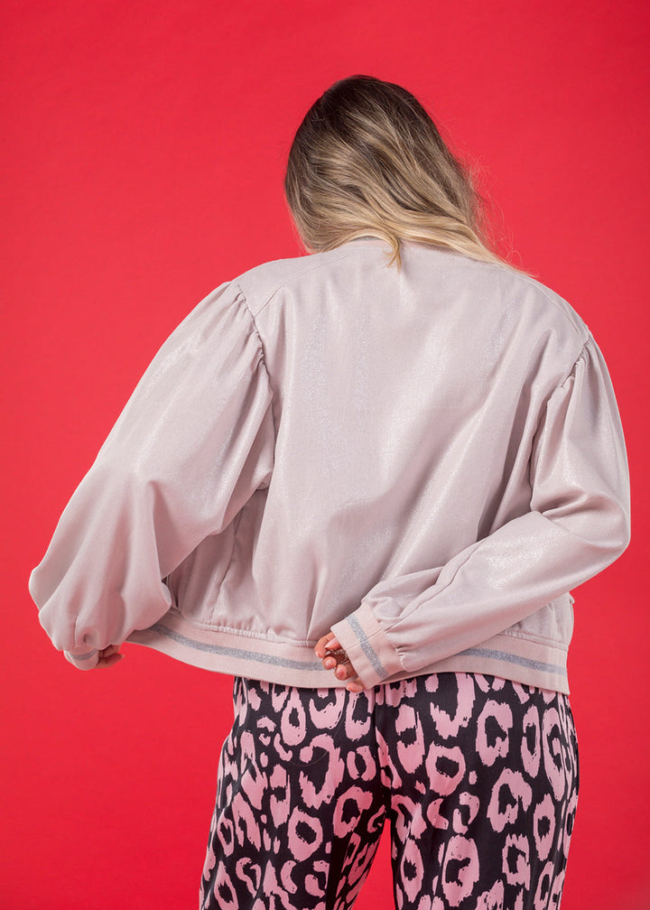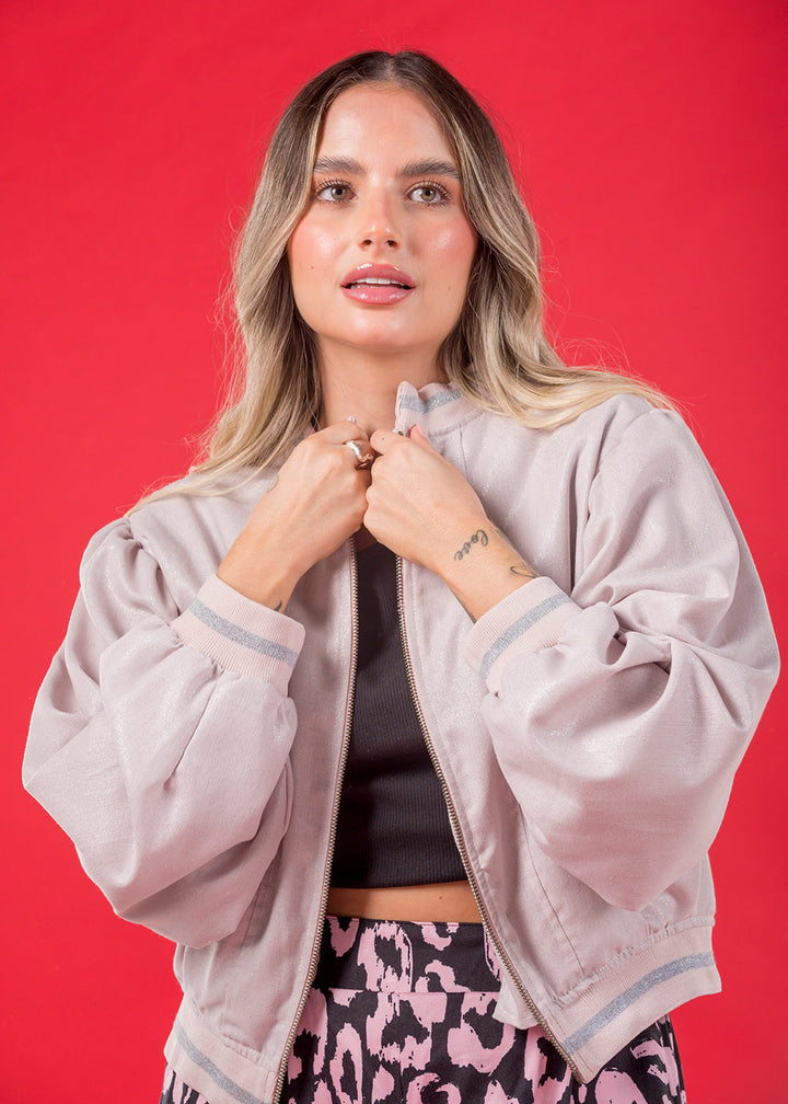 Lilac linen-effect jacket with lurex. Features a collar, cuffs, and waistband in fabric. Gathered sleeves at the shoulder and cuffs, front zipper closure, and functional flap pockets on the front. Loose fit silhouette.