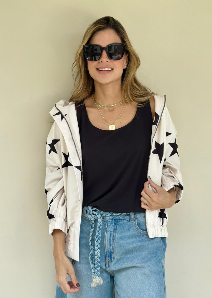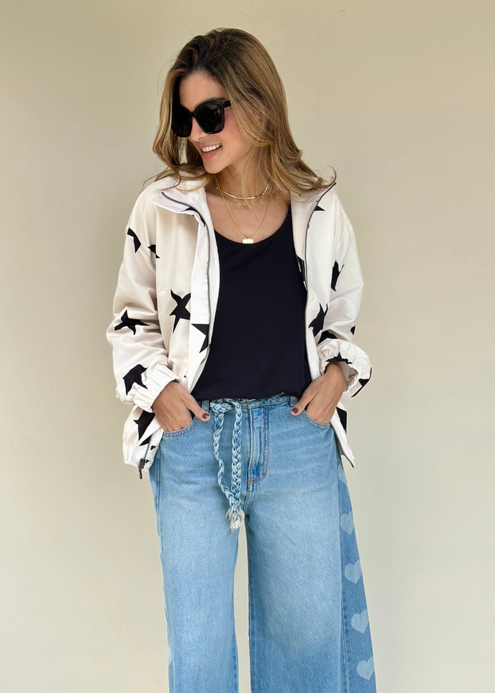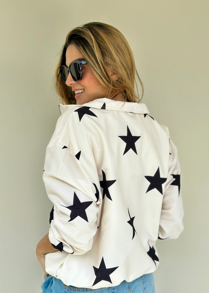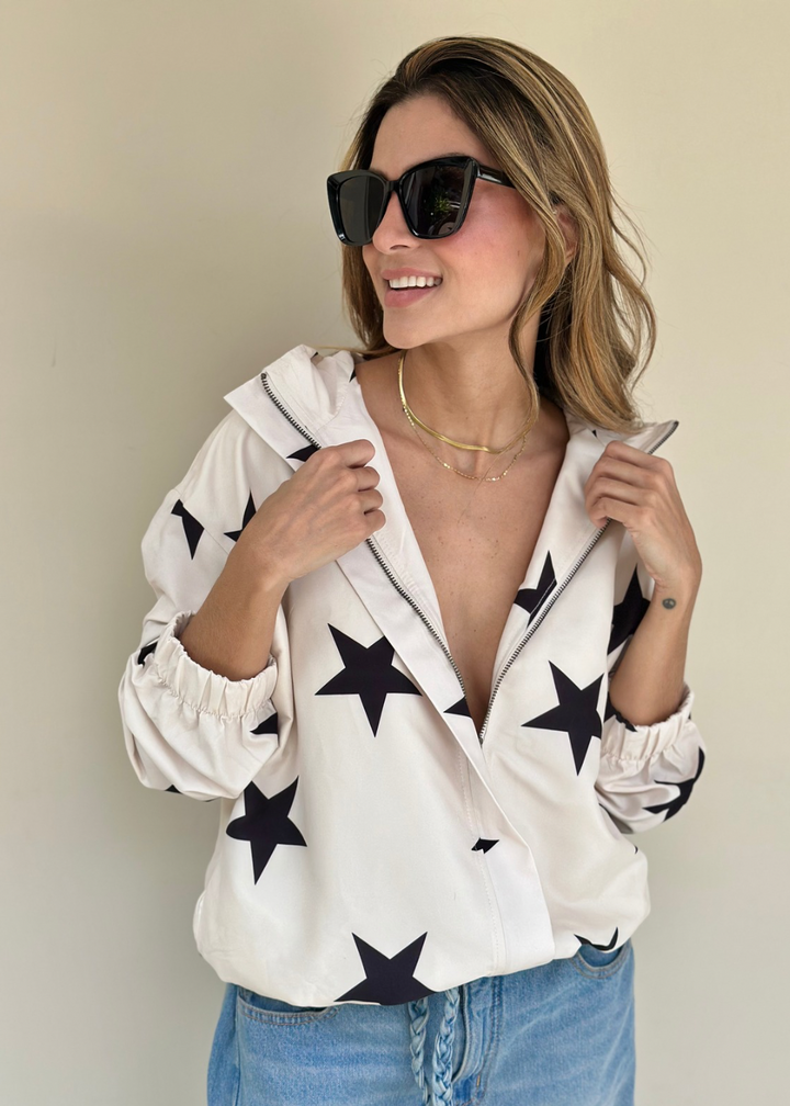 A modern ivory jacket designed with an exclusive star-print sublimation for a standout look. Crafted in lightweight water-repellent fabric, it features a high collar, front zip closure, functional side pockets, and elasticated cuffs and waistband for comfort and fit. With its semi-fitted silhouette, this versatile jacket is perfect for layering on cool days, outdoor activities, or adding a stylish touch to casual looks.