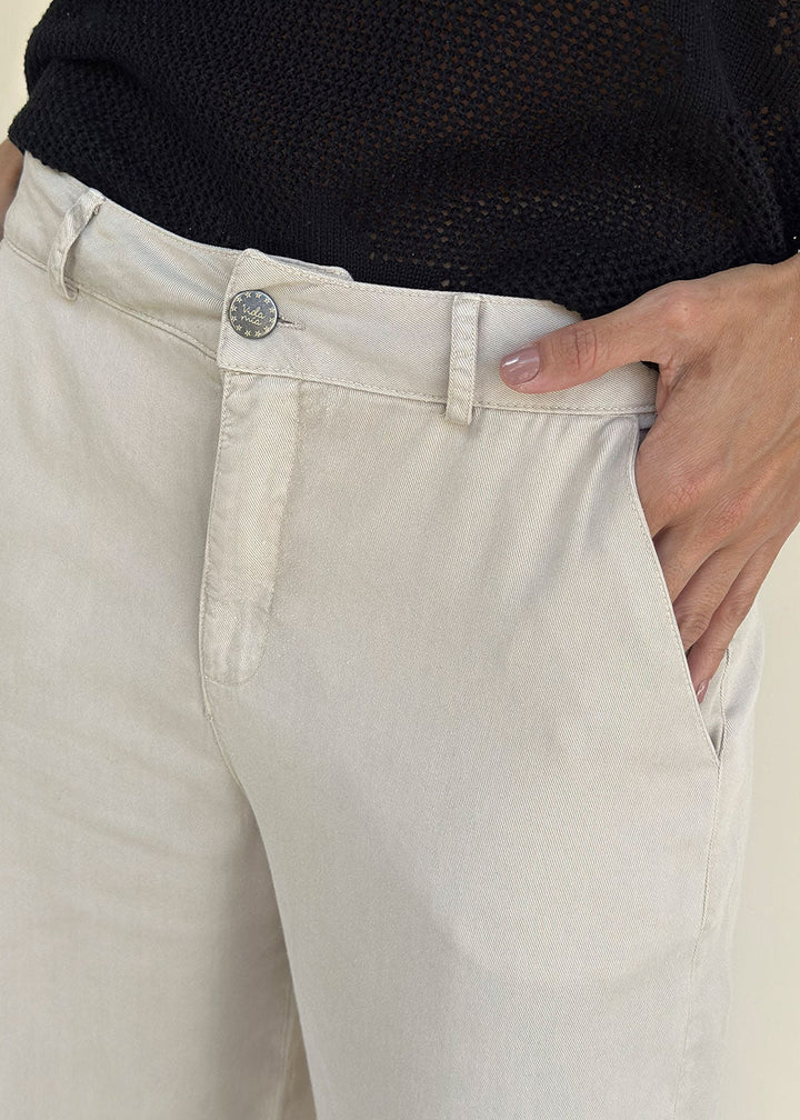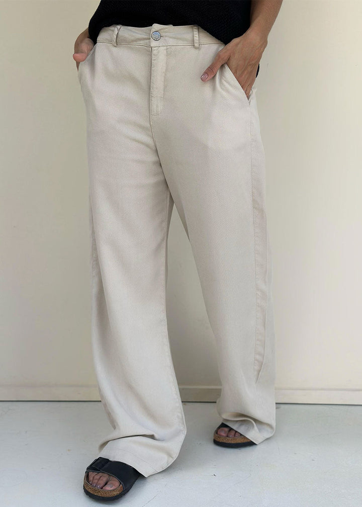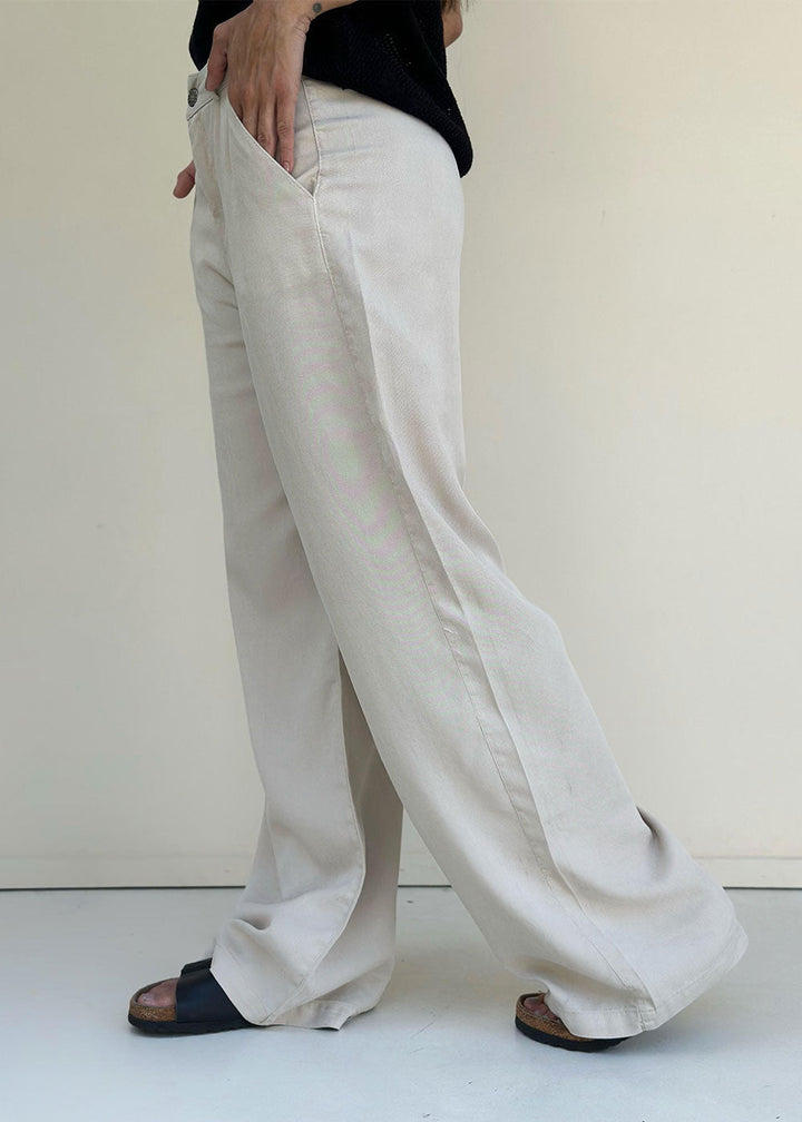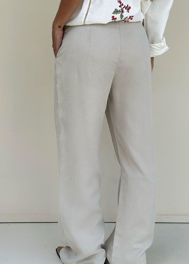 High-waisted beige pants in soft and breathable Tencel fabric. Featuring belt loops and functional side pockets, these flattering fitted pants are perfect for everyday elegance with comfort.