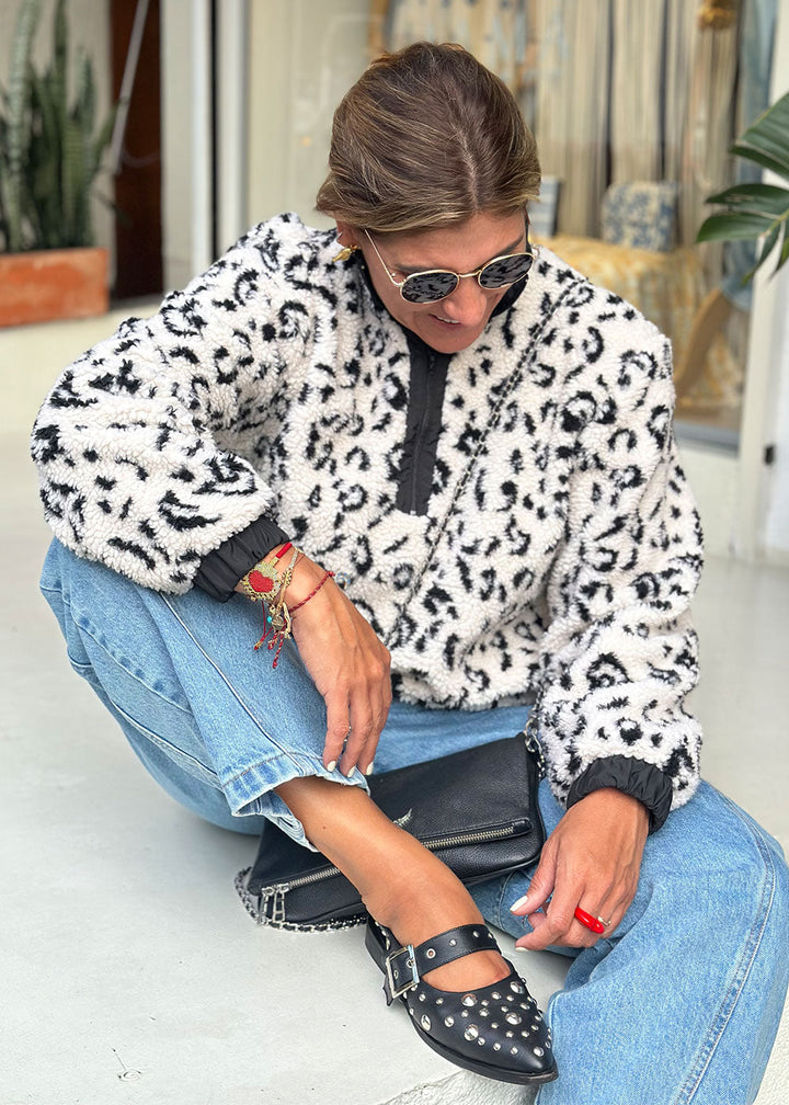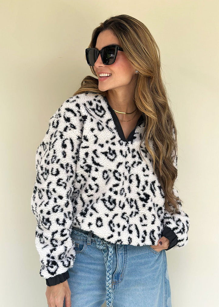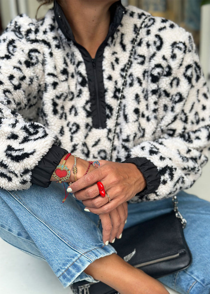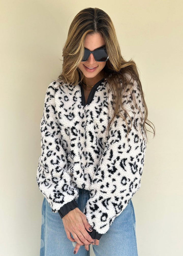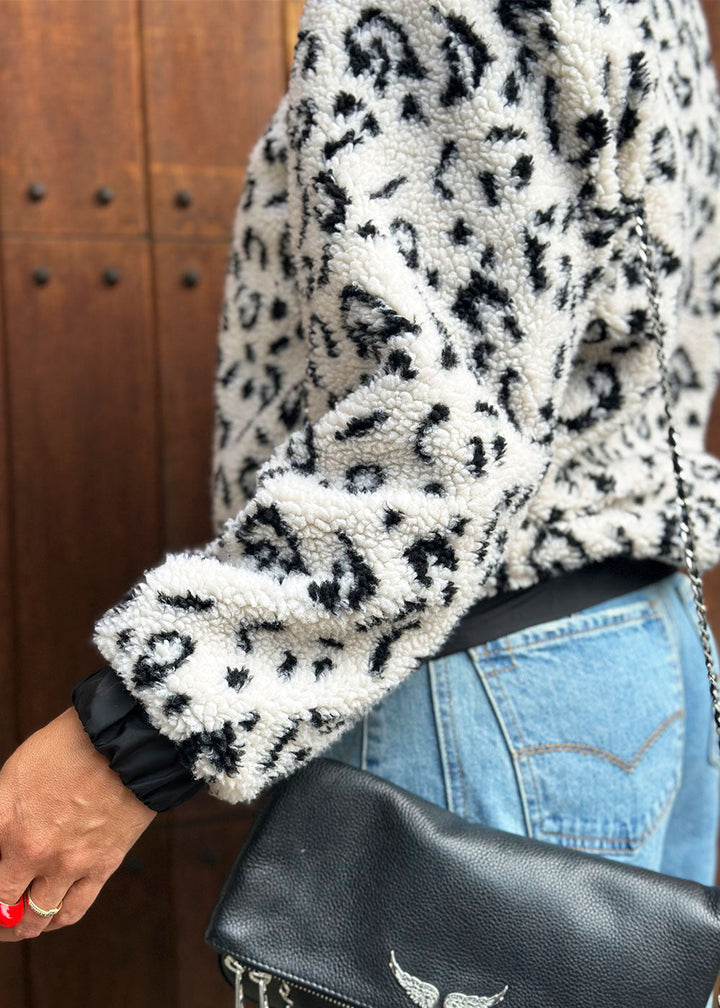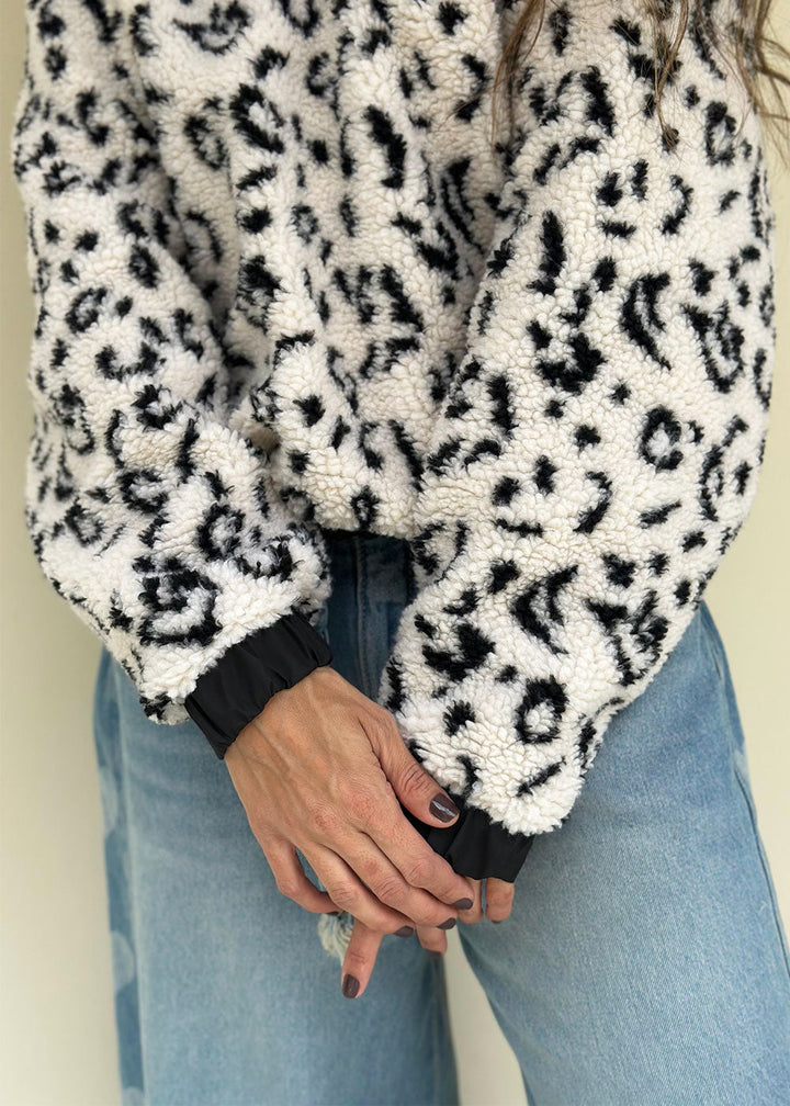 A bold and cozy statement piece crafted in soft faux shearling with a chic animal print. Featuring a high collar with front zipper placket, elastic cuffs and hem for a flattering fit, and functional front pockets for practicality. Its semi-fitted silhouette offers both warmth and style, making it the perfect jacket for casual outings, layering over everyday looks, or adding a trendy twist to evening wear.