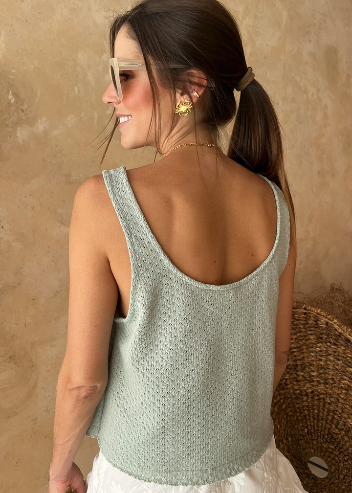 Green jersey blouse. Round neckline at the front and back, sleeveless, and a cut hem.Semi-fitted silhouette.