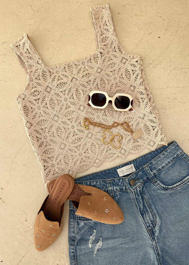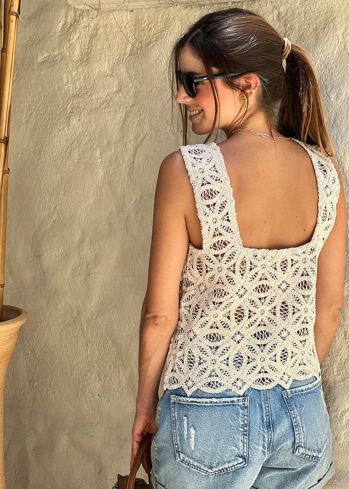 Ivory crochet blouse. Square neckline at the front and back, sleeveless, and ruffled hem.Wide silhouette.