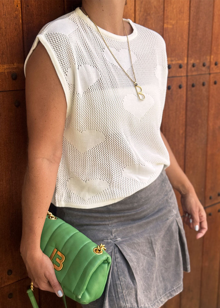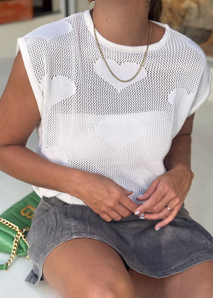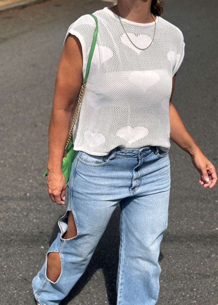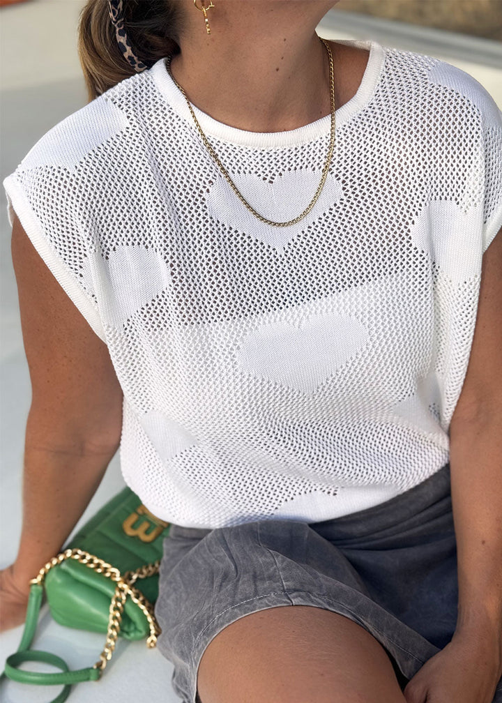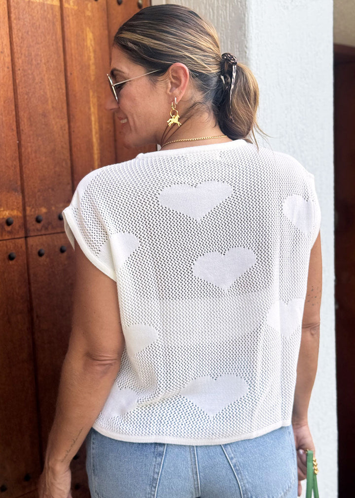 Ivory blouse with heart-patterned fabric. Round neckline, dropped shoulders, and wide sleeves.