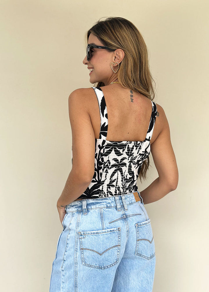 Camisa en lino color beige con estampado fondeado negro. Escote frente en corazón, cintura tipo corset. Espalda con nido de abeja y cargaderas delgadas.