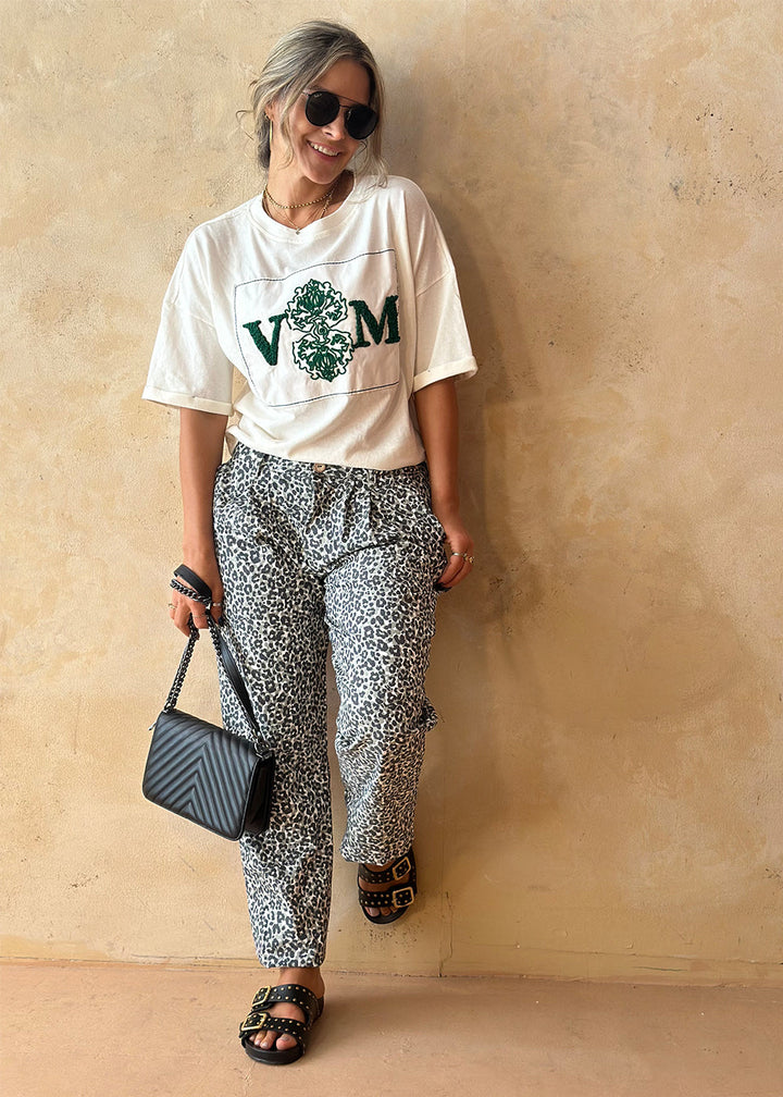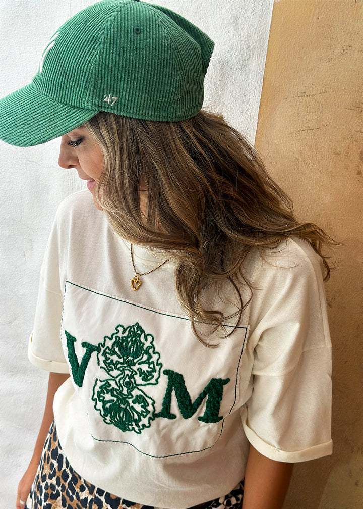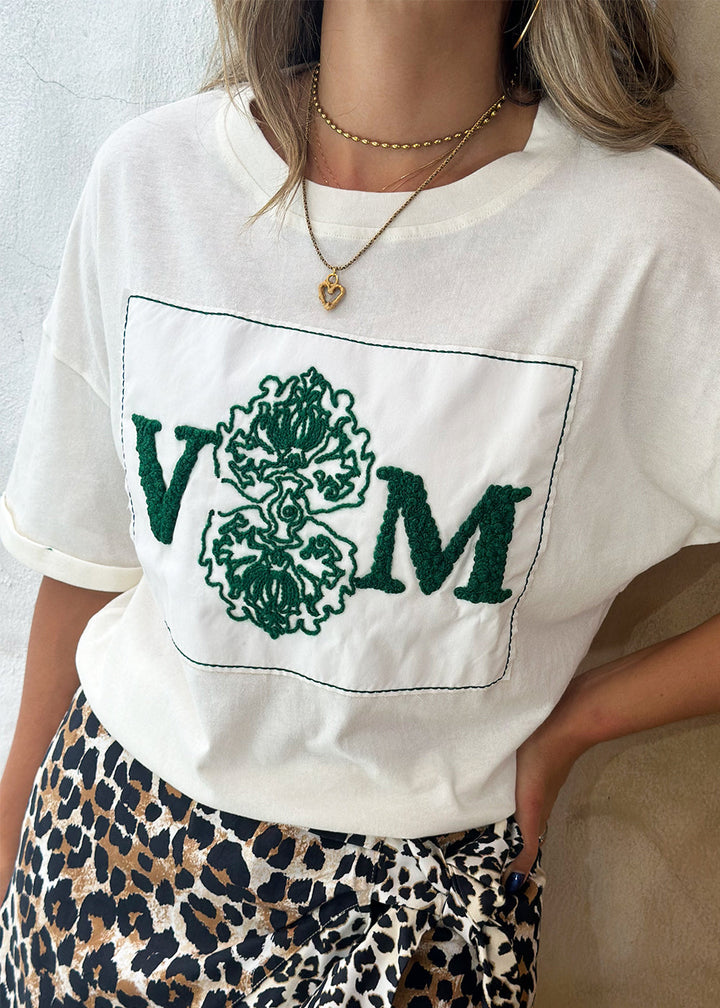 T-shirt in ivory knit fabric. Features a round neckline, drop shoulders, short sleeves with rolled cuffs, and an embroidered patch at the center front. Loose silhouette