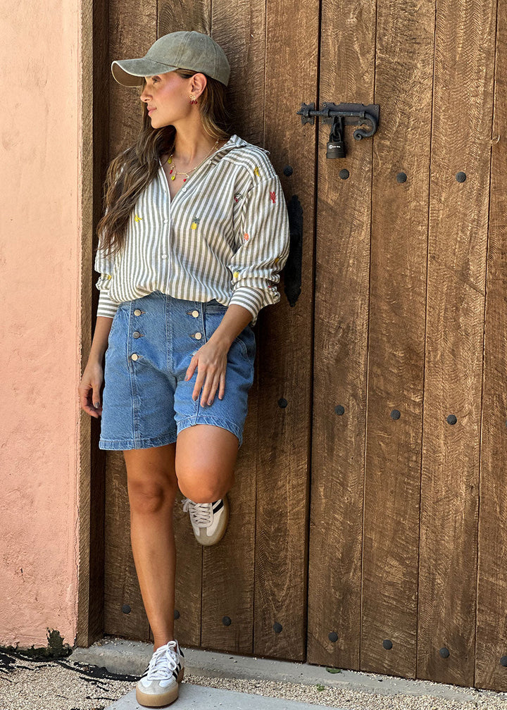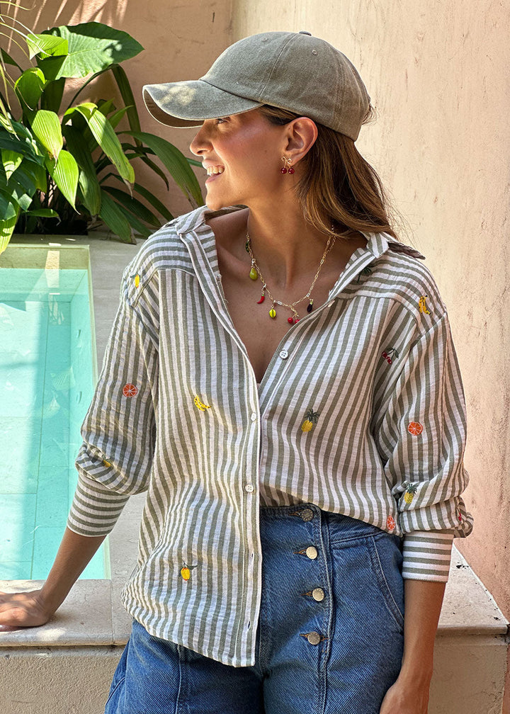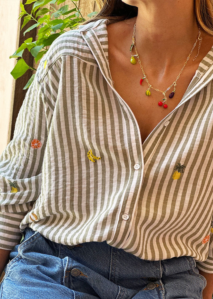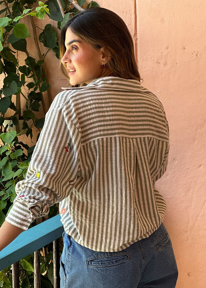 Challis shirt with vertical stripes in green and ivory. Long sleeves with button cuffs, band collar, pleats on the front and back with center pin. It also features embroidery on the sleeves and front.