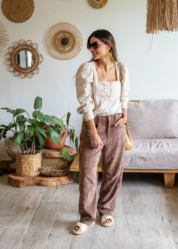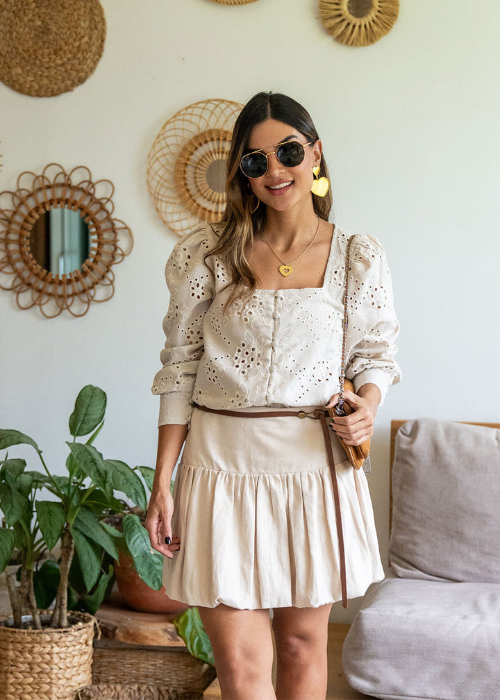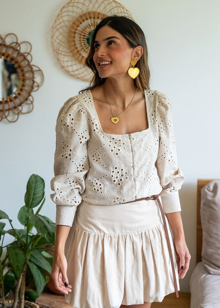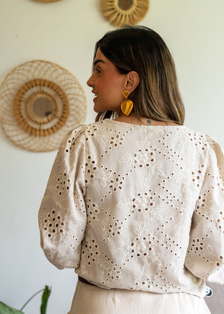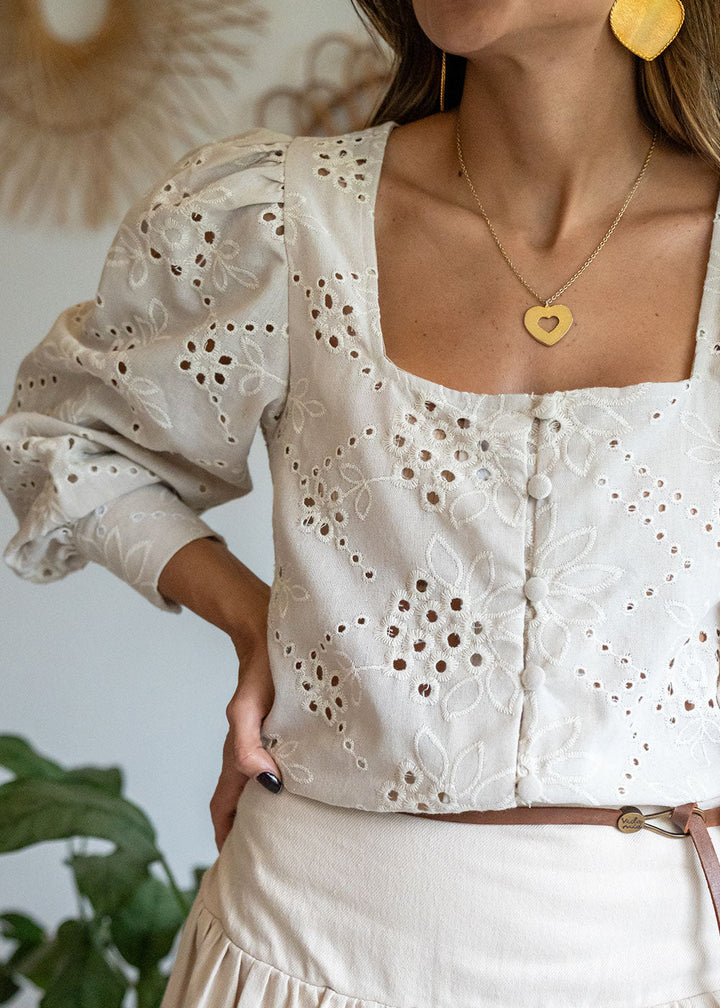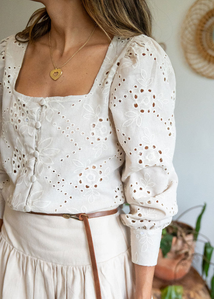 Shirt in camel-colored eyelet fabric. Features a square neckline in the front, button placket with covered buttons, gathered shoulders, wide cuffs with covered buttons, and side slits.