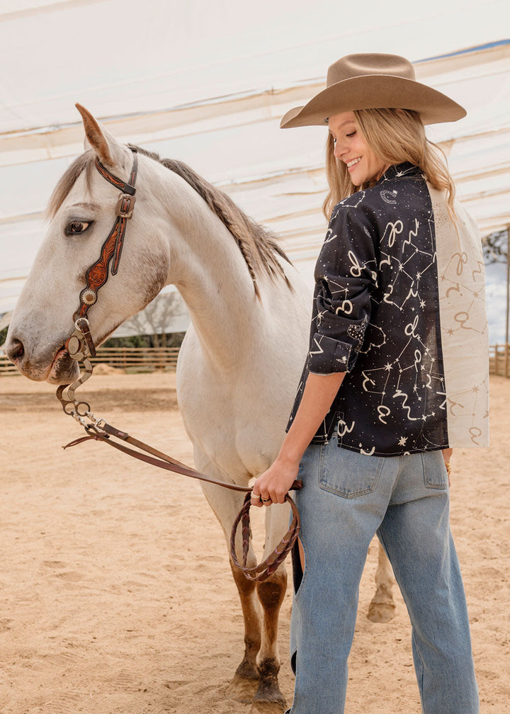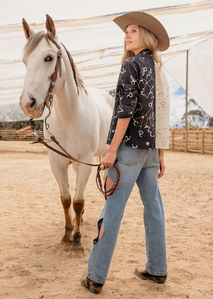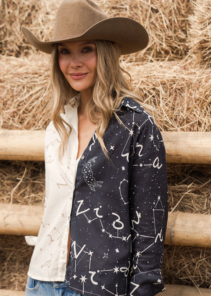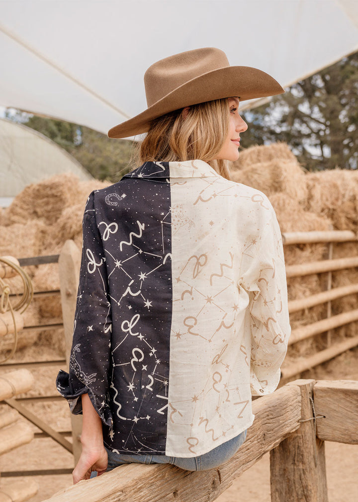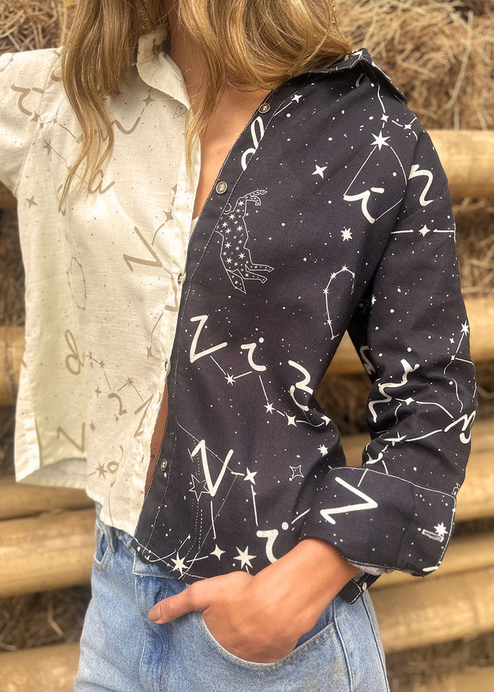 Shirt in linen-effect fabric with a tonal print in black and ivory. Long sleeves, banded collar, and buttons.