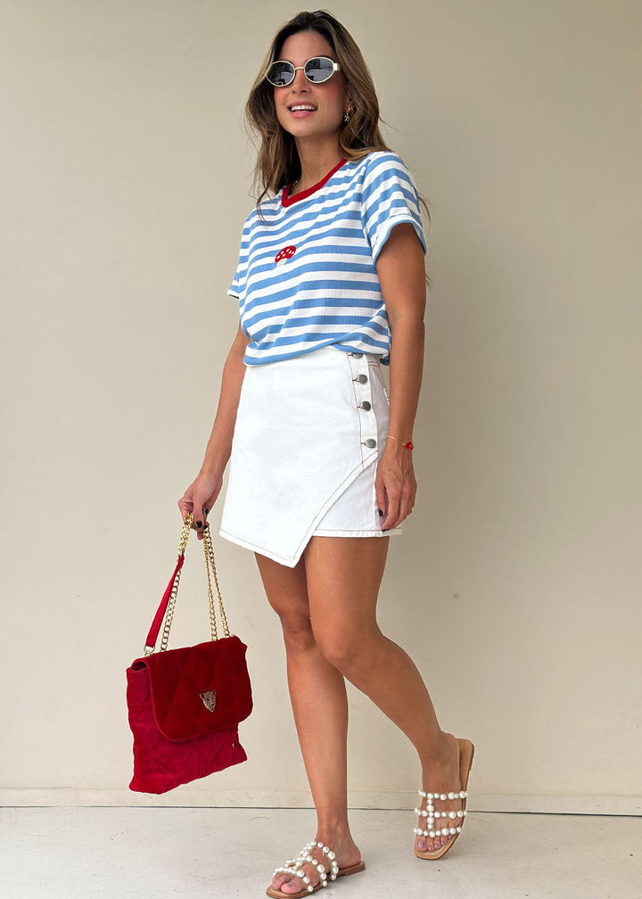 Camiseta en tejido de punto con rayas blancas y azules y bordado de hongo en centro frente. Cuello redondo en rib color rojo y mangas con guardapolvo..