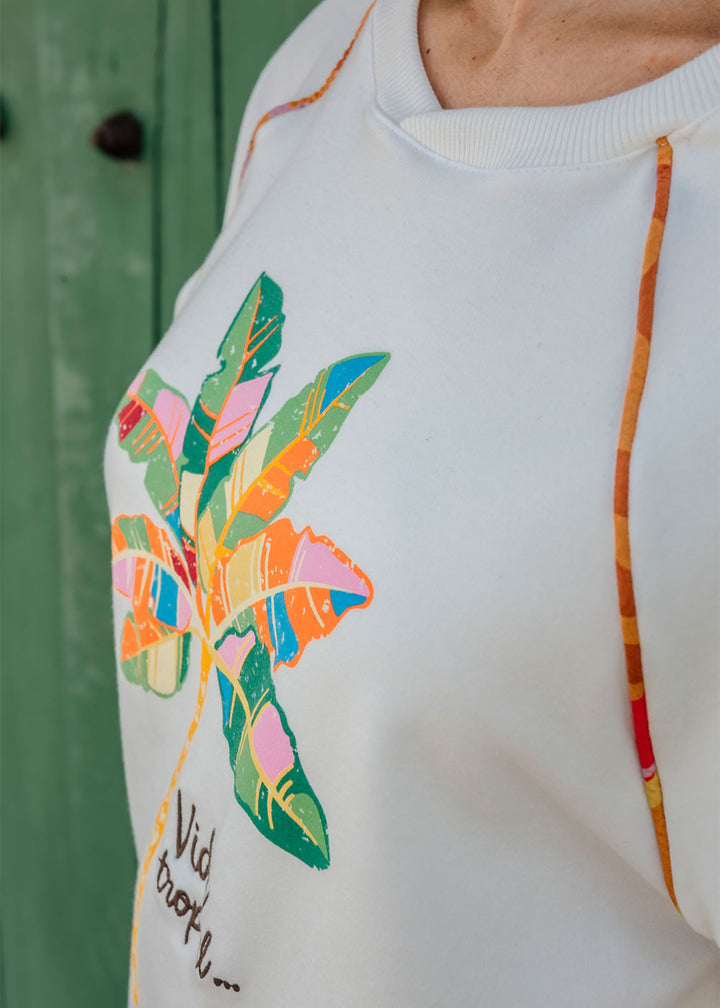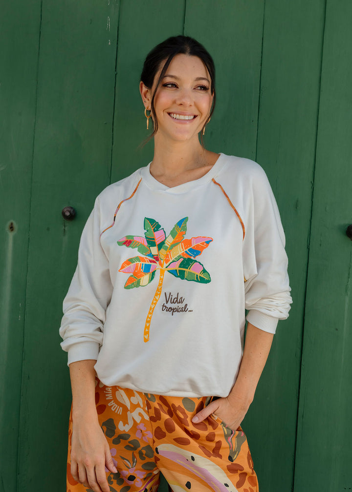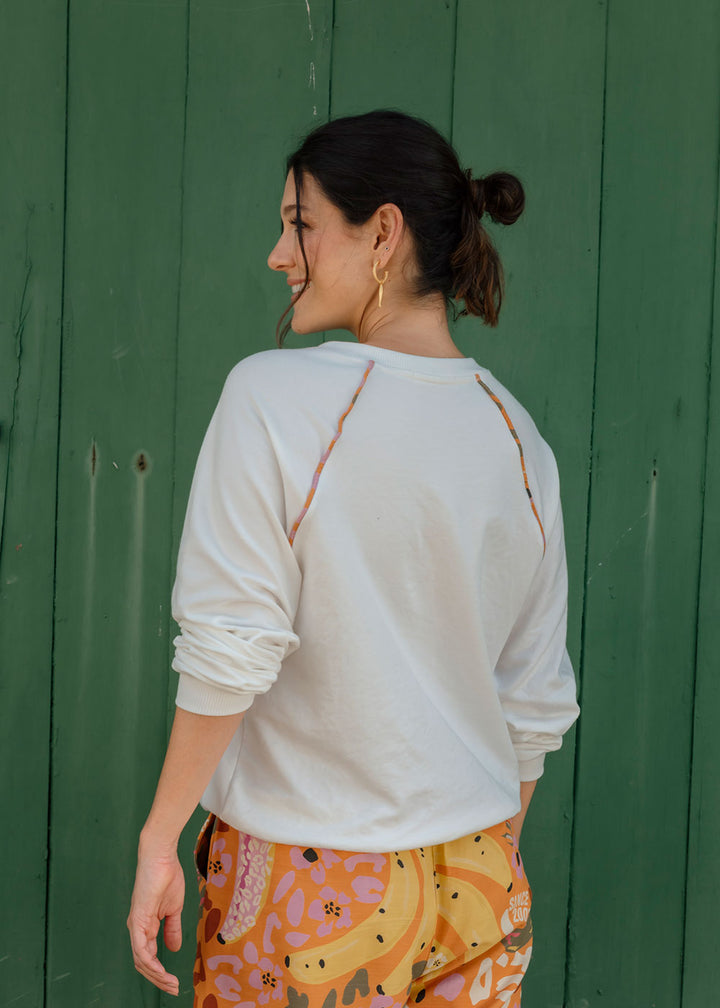 Celia is an ivory crew-neck sweatshirt with front textile print, raglan sleeves, printed piping, and ribbed cuffs and hem.